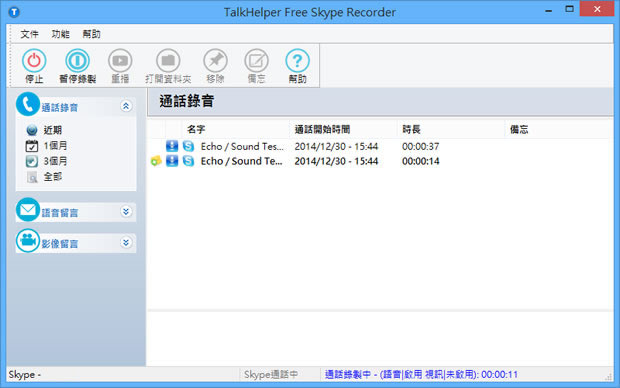 首頁電腦軟體社群與通訊 TalkHelper Free Skype Recorder Skype 通話錄音與錄影(繁體中文版) 2017-7-6 更新:已改為試用與付費 微軟的 Skype 是一套可透過網際網路來進行設備(電腦、手機、平板)間通訊的應用軟體,除具有一般通話軟體的收發即時訊息、傳輸檔案、收發多媒體資訊與進行視訊通話功能外,另外亦可在超商購買通話點數,讓來電轉接到設備、指定的電話號碼或由設備打到市話、行動電話、發簡訊等,且費率較現行的通話費率還低。想要在 Skype 通話期間進行錄音、錄影時,可以來使用 TalkHelper Free Skype Recorder 這套免費軟體,可將聲音錄製成 mp3 聲音格式而影片則是錄製成 AVI 影片格式,相當方便。 🔔 不錯過任何精彩! 立即訂閱我們的 LINE 官方帳號 每次發佈新文章時,您將會第一時間收到本站文章連結通知,輕鬆掌握最新資訊! 使用 LINE 追蹤文章更新 §相關文章,還可以參閱:如何將 LINE 變成可備份相片的雲端硬碟?[ LINE ]如何傳送訊息給自己?[ LINE ]如何用電腦版還原條碼內容?[ LINE ]如何設定單一或全部好友的聊天室背景?[ LINE ]如何傳送「無聲訊息」? 如何使用 TalkHelper ? 1.完成安裝,開啟 TalkHelper 後,會先檢測電腦內有無安裝 Skype ,再經過授權的驗證程序。 2.接下來每次通話便會自動錄音並存檔。 3.要變更 TalkHelper 介面語言,可點擊上方功能表的[Tools] > [Change Language] > [繁體中文]。 TalkHelper Free Skype Recorder版本:5.10語言:繁體中文(多國語言)適用:Windows官方網站:http://www.talkhelper.com/下載:按我下載