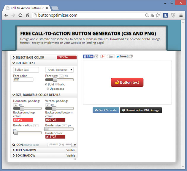 對初學網頁製作的人來說,當需要對「按鈕」元件進行美工時,若能參考別人寫好的 CSS Code 是一個事半功倍的好方法。Call-to-Action Button Generator 是一個可即時預覽的 CSS 按鈕線上產生器,不但提供按鈕顏色、文字、陰影、ICON 等屬性自訂外,還可自動產生所需的 CSS Code 與 PNG 圖檔,讓使用者方便影用到網頁的任意處,相當方便。