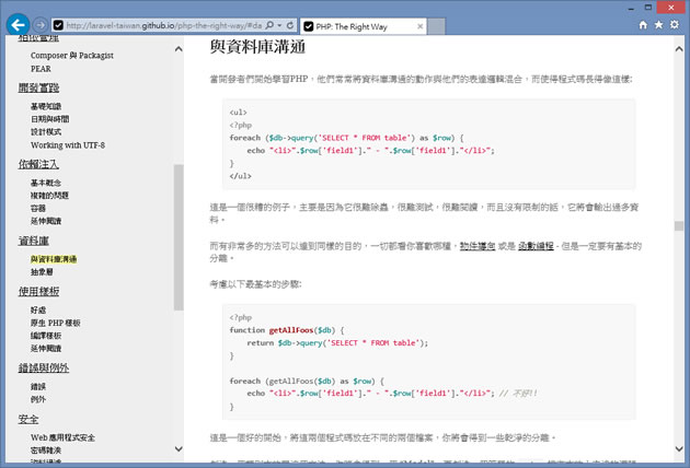 首頁線上工具開發工具 The Right Way - PHP 免費電子書(簡、繁體中文版) PHP 是很多人開發網頁應用程式的首選,如果你也想自學或更進階,可以來參考 The Right Way 這個線上 PHP 免費電子書,其以 PHP 最新穩定版本來介紹,讓新手學習時,從開發環境的建立到開發中有可能遇到的狀況與最後程式布署鉅細靡遺,可免遭網路上過時資訊而事倍功半。 🔔 不錯過任何精彩! 立即訂閱我們的 LINE 官方帳號 每次發佈新文章時,您將會第一時間收到本站文章連結通知,輕鬆掌握最新資訊! 使用 LINE 追蹤文章更新 §相關文章,還可以參閱:網站效能健檢免費工具!PageTest 多裝置模擬效能分析及由 AI 提出改進建議Regex-Vis 圖解正則表達式的線上工具,可編寫還可驗證Sitemap Generator:線上快速產生符合 SEO 標準的網站地圖,無網址數量限制適用各類型網站網站隱私權政策產生器 Privacy Policy Generator:輸入網站名稱和網址即可輕鬆生成專屬條款Frame0:輕鬆繪製應用程式流程圖、UML 和介面雛形的免費工具,適用於 macOS 與 Windows The Right Way 網站介紹 使用瀏覽器進入 The Right Way 網站,可展開左側欄的教程目錄,來尋找自己感興趣的文章。 The Right Way網站網址:https://laravel-taiwan.github.io/php-the-right-way/