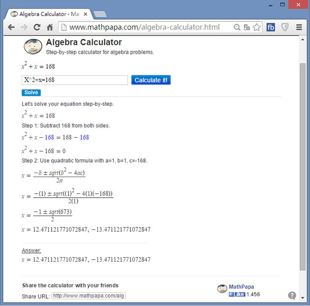 首頁教育學習數學 MathPapa - Algebra Calculator 線上數學解題,不是只有答案,連步驟都很清楚 不論是在校生或是社會人士,對於較難的數學題,像是分數、指數、多項式、圖形、方程式等等,通常答案會比較容易獲得,但對計算過程,卻是一無所知,想要有正確答案與計算步驟,不妨來 Algebra Calculator 這個網站,不但有答案,還清楚地列出計算步驟,幫你複習。 🔔 不錯過任何精彩! 立即訂閱我們的 LINE 官方帳號 每次發佈新文章時,您將會第一時間收到本站文章連結通知,輕鬆掌握最新資訊! 使用 LINE 追蹤文章更新 §相關文章,還可以參閱:Math Bot:GPT-4o 支援的 AI 數學求解器,提供詳細解題步驟Mathic:免費線上加減乘除運算式組合練習平台,挑戰四則運算極限AI Math:免費數學學習AI工具,詳列解題過程並提供解說Microsoft Math Solver 代數、三角函數及微積分等數學題目的最佳解題工具,不僅有答案、步驟還會出練習題「算術題、口算題在線生成器」快速產生加、減、乘、除數學練習題目 如何使用 Algebra Calculator ? 1.使用瀏覽器進入 MathPapa - Algebra Calculator 網站,點擊[Algebra Calculator »]。 2.輸入數學算式,再點擊[Calculate it!]便會列出詳細的計算過程。 Algebra Calculator網站網址:https://www.mathpapa.com/