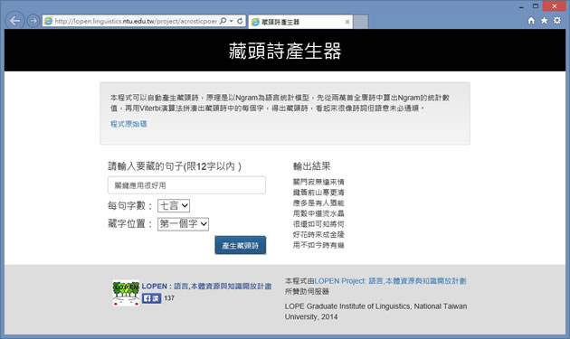 首頁線上工具生活資訊 五言或七言「藏頭詩產生器」 雖無古人在七步、五步即可成詩的文學素養,但想要將有意義的關鍵字,藏身於五言或七言詩體中,可以來試試這個「藏頭詩產生器」,只要輸入關鍵字例如自己或小孩的名字,再來選擇五言或七言及要藏於詩中的第幾個字,便可自動產生。至於怎麼做出來的,原網站上有說明,並提供程式原始碼下載。 🔔 不錯過任何精彩! 立即訂閱我們的 LINE 官方帳號 每次發佈新文章時,您將會第一時間收到本站文章連結通知,輕鬆掌握最新資訊! 使用 LINE 追蹤文章更新 §相關文章,還可以參閱:Apple Music 台灣新用戶優惠:6個月免費暢聽,領取方式與限制一次看!2026春節追劇清單!Netflix 2月必看攻略:燒腦推理、火爆動作片,陪你從初一爽追到開工!459 萬人搶 60 萬份!運動幣中獎號碼公布,快查你的身分證尾數都馬一起GO!LINE GO新年優惠最高拿$800優惠券,還有一個月乘車金等你抽過年搭高鐵自由座要排多久?看LINE就知道 台灣高鐵×LINE TODAY推出春節限定燈號預估服務 如何使用「藏頭詩產生器」? 1.使用瀏覽器進入 「藏頭詩產生器」後,依要求輸入所需要的資訊,點擊[產生藏頭詩]。 2.接下來便會自動產生藏頭詩。 藏頭詩產生器網站網址:https://lopen.linguistics.ntu.edu.tw/