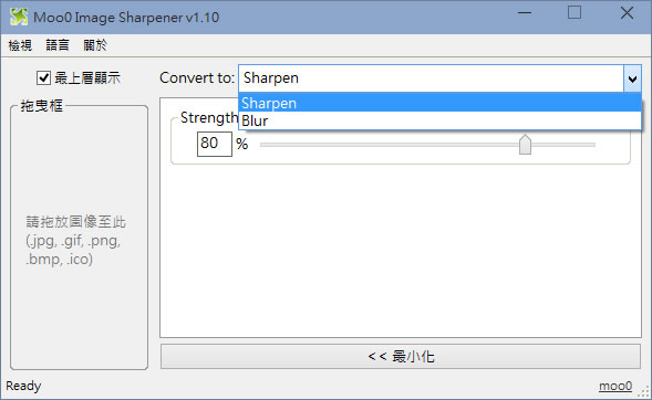 首頁電腦軟體影像繪圖 Moo0 Image Sharpener 讓圖片更加銳利化或模糊 對所拍攝的相片,希望能在清晰點或要分享時又希望能夠稍微模糊點,就可以透過 Moo0 Image Sharpener 這套應用程式來操作,只要設定要銳利化或模糊化,再設定強度,便可輕鬆完成。 🔔 不錯過任何精彩! 立即訂閱我們的 LINE 官方帳號 每次發佈新文章時,您將會第一時間收到本站文章連結通知,輕鬆掌握最新資訊! 使用 LINE 追蹤文章更新 §相關文章,還可以參閱:告別訂閱制!Canva 旗下 Affinity 永久免費,向量設計、影像處理、排版工具全面開放Pineapple Pictures 載入速度超快的相片檢視器(免安裝)PhotoResizerOK 可快速調整圖片尺寸的免費軟體ShortDoorNote 將輸入的文字快速轉成圖片Bzzt! Image Editor 圖片批次壓縮、轉檔及尺寸調整的免費工具 如何使用 Moo0 Image Sharpener ? 1.完成安裝,開啟 Moo0 Image Sharpener 後,點擊[ 進階選項 ]。 2.選擇要清晰(Sharpener)還是模糊(Blur)並設定其強度後,將相片使用滑鼠拖進拖曳區內,便會開始執行。 Moo0 Image Sharpener版本:1.10語言:中文性質:免費適用:Windows官方網站:http://www.moo0.com/下載:按我下載