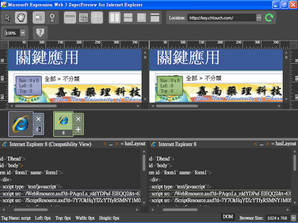 1.下載並安裝後,開啟 Microsoft Expression Web SuperPreview for Windows Internet Explorer 主程式介面,開啟後可以看到左右兩邊視窗,分別可以選擇設定要測試使用的 IE 版本,包括 Internet Explorer 6, Internet Explorer 7 相容模式與 Internet Explorer 8 。