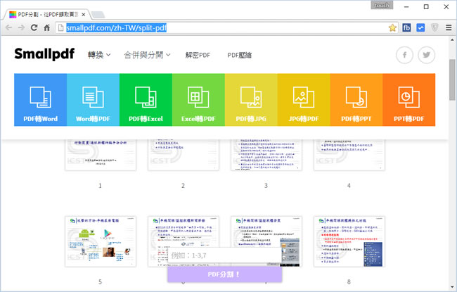 首頁線上工具檔案管理 SmallPDF - PDF 線上應用工具,可壓縮、分隔、合併、轉檔、解除保全... PDF 類型的檔案,因其可跨平台的特性,不論是在 Windows、Android、Mac 作業系統間都廣為應用,想要為拿到的 PDF 檔案進行瘦身、解除保全或是合併、分割的動作,不需要到處找免費的應用工具來安裝了,可以來 SmallPDF 這個線上應用工具,可壓縮、分隔、合併、JPG to PDF、PDF to JPG、PDF to Excel、PDF to PPT、解除保全...等功能。 🔔 不錯過任何精彩! 立即訂閱我們的 LINE 官方帳號 每次發佈新文章時,您將會第一時間收到本站文章連結通知,輕鬆掌握最新資訊! 使用 LINE 追蹤文章更新 §相關文章,還可以參閱:VERT:開源本地端檔案格式轉換器,隱私優先的免費瀏覽器轉檔工具PageSplitty 線上 PDF 分割轉 JPG、PNG、WebP 圖工具,支援 5GB 大小的大檔案PixDuplicate:免上傳快速找出並刪除重複照片的免費線上工具Adapter:全方位影片、音檔及圖片格式轉換免費軟體,支援影片轉音檔與圖片,音檔及圖片格式互轉TextCompare 線上比較 Excel、PDF 及圖片,快速找出檔案不同之處 如何使用 SmallPDF? 1.使用滑鼠將檔案拖拉到 Drop PDF here,便會開始上傳與處理。 2.接下來,從上方功能表,選擇要執行的功能。 3.完成後,便可下載。 SmallPDF網站網址:http://smallpdf.com/
