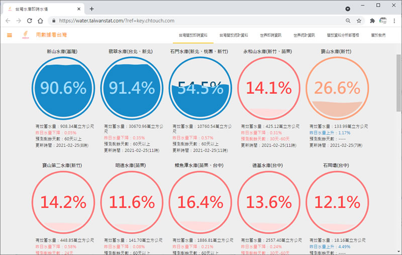 首頁線上工具生活資訊 線上查詢台灣主要水庫蓄水量 不論是工業用水還是民生用水,缺水的警訊從年底響到今年,水情嚴峻,不論有無下雨,到底水庫的進水狀況如何呢?應該沒有人會天天跑去水庫看水位變化吧?其實到 台灣地區主要水庫蓄水量報告表 就可線上查詢進水量、出水量、水位、蓄水百分比等資訊,時間點可從 2003年開始查詢到最近的前一日,各項資料由各水庫管理單位在每日上午8時30分前輸入(星期六、日之資料則在星期一統一輸入),另外一個網站 台灣水庫即時水情 利用圖形化顯示各水庫蓄水量,更能一目瞭然,不過說到底,無論如何,節約用水,共體時艱。 🔔 不錯過任何精彩! 立即訂閱我們的 LINE 官方帳號 每次發佈新文章時,您將會第一時間收到本站文章連結通知,輕鬆掌握最新資訊! 使用 LINE 追蹤文章更新 §相關文章,還可以參閱:【2026行事曆】115年春節放9天史上最長!9大連假、寒暑假時間一次看臺北捷運QR乘車碼上路!支付業者、信用卡感應、轉乘優惠完整攻略Disney+ 跨年追劇清單!2025年末7部台韓美陸劇+1部必看演唱會電影2026台北跨年全攻略:演唱會時間地點、完整卡司名單、101煙火轉播懶人包Gemini 新年賀卡來了!日本郵便推出『#Gemini で年賀状』服務,9種模板3種尺寸任選 如何使用「台灣地區主要水庫蓄水量報告表」? 1.使用瀏覽器進入台灣地區主要水庫蓄水量報告表網站,就可點選要查詢的水庫名稱與日期,也可以轉為 Excel(只能一天一天轉) 。 (以上圖片非最新資料) 2.台灣水庫即時水情所提供的圖表。 (以上圖片非最新資料) 台灣主要水庫蓄水量相關網址: 台灣地區主要水庫蓄水量報告表 台灣水庫即時水情