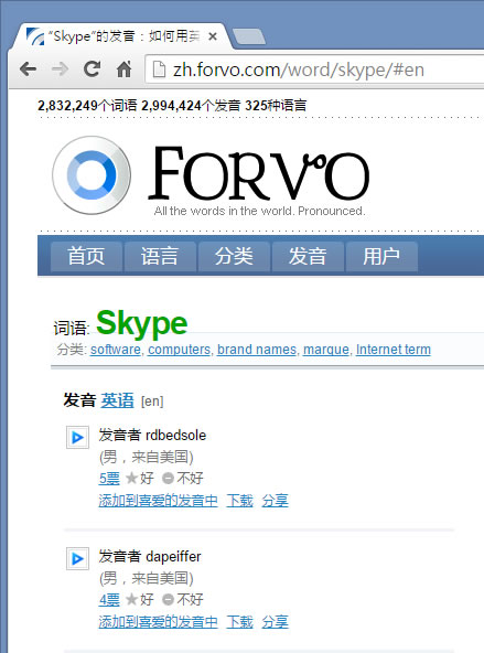 首頁線上工具生活資訊 Forvo 讓母語所在地的人教你各種詞語發音 對各種語言的發音來說,常會因區域的關係而形成自有的特色,若在這個區域如不這樣發音,反而會讓人聽不懂,但對來自該母語國家而來的人來說,這樣的發音卻是讓他們一頭霧水,例如 Skype、Instagram、IEAK、Costco、YouTube...等等的發音,新聞也常有報導該如何正確發音,如果沒記起來,沒關係,可到 Forvo 這個提供中文、英文、日語、法文......等等全世界各國真人的語音發音,教你最正確的發音。 🔔 不錯過任何精彩! 立即訂閱我們的 LINE 官方帳號 每次發佈新文章時,您將會第一時間收到本站文章連結通知,輕鬆掌握最新資訊! 使用 LINE 追蹤文章更新 §相關文章,還可以參閱:2026年特色春聯索取指南:總統府、法鼓山、靈鷲山等重點發放據點整理辦護照預約排到 4 月?免排隊秘訣:線上有條件申換,10 個工作日搞定Apple 新一代 AirTag 登場:尋找範圍增 50%,五大升級、售價完整解析2026春節新鈔兌換懶人包|兌換時間地點查詢,手機收發數位紅包教學科技公司拍電影能贏好萊塢嗎?Apple 狂掃六項奧斯卡提名給你答案 如何使用 Forvo ? 1.使用瀏覽器進入 Forvo 網站,可在右上角輸入你要查詢發音的詞語後,點擊[ 搜索 ]。 2.接下來就會得到各國人所上傳對該詞語的發音,點擊所要學習的語音後,便可點擊播放按鈕來播放學習。 Forvo網站網址:https://zh.forvo.com/