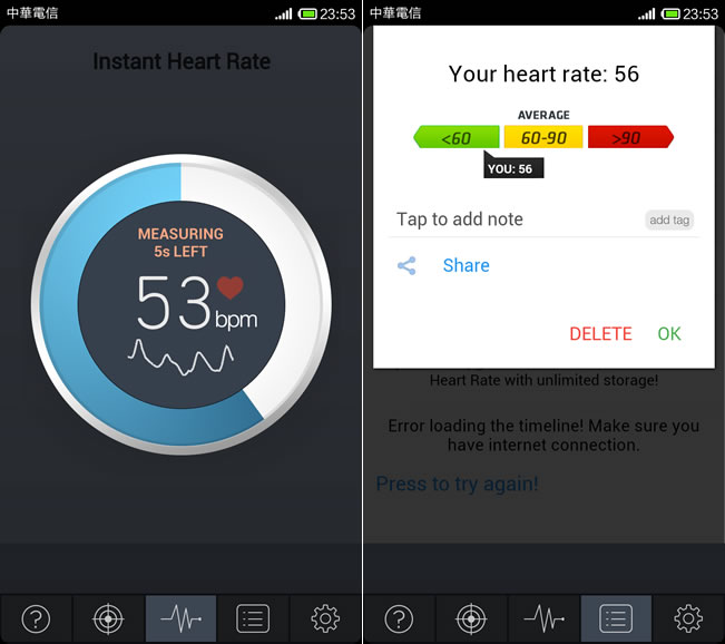 首頁移動設備生活資訊 ﹝Android﹞Instant Heart Rate 用手機就能測量脈搏跳動 在沒有儀器的幫助下,若要測得脈搏每分鐘的跳動次數,不是手搭在心臟上方,要不就是搭在左、右手腕上,然後眼睛盯著時間,心理開始默數,持續一分鐘,這樣的動作在靜態的時候,也許不會有甚麼問題,但若在劇烈運動後,想要立刻量下自己的心跳數,恐怕就不是很精準,想時時刻刻做好自己的健康管理,或許你可以考慮 Instant Heart Rate 這套利用手機的照相鏡頭就能量測出脈搏的跳動數據,也能夠搭配到 Google Fit 做出更好的運動健身管理。 🔔 不錯過任何精彩! 立即訂閱我們的 LINE 官方帳號 每次發佈新文章時,您將會第一時間收到本站文章連結通知,輕鬆掌握最新資訊! 使用 LINE 追蹤文章更新 §相關文章,還可以參閱:停車不再靠運氣!用 LINE「雞來客棧_GLike」機器人 3秒快速找車位Google Play 公布 2023 年度最佳遊戲及應用程式榜單「中央氣象局E-地震測報」APP即時掌握地震動態手機開啟 Google 搜尋「Pac-Man」就讓 Hello Kitty、小精靈、布丁狗及動漫人物以 3D 出現在現實環境中手機開啟 Google 搜尋動物名稱,就可利用 AR 技術將其融入到現實環境中 如何使用 Instant Heart Rate? 1.完成安裝,開啟 Instant Heart Rate 後,便可看到使用圖解說明,首先先點擊界面下方最中間的圖示按鈕,照相機的閃光燈便會開啟,此時將手指壓住照相鏡頭,便可開始量測程序。 2.量測期間與完成後,螢幕會顯示目前所測得的數據。 3.若想將該數據連結到 Google Fit 內管理,可點擊最右下角的設定按鈕,來設定與 Google Fit 連結,當開啟 Google Fit 圖表,選擇[ 心跳速率 ]便可以圖表的方式查看數據。 Instant Heart RateAPP性質:免費官方網站:https://play.google.com/store/apps/details?id=si.modula.android.instantheartrate