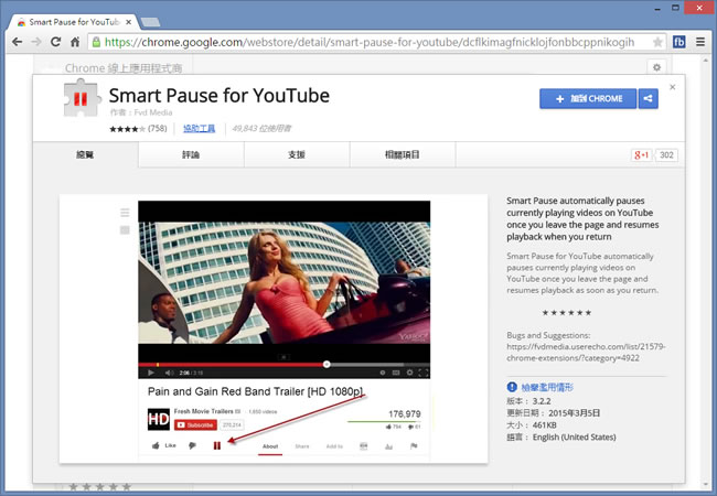 首頁瀏覽器擴充功能網頁瀏覽 Smart Pause for YouTube 開啟新分頁時,正在播放的 YouTube 就能自動暫停,切回時,自動繼續播放 想想若正在 YouTube 觀賞需要便看邊筆記的教學影片,例如程式設計影片,要利用 OneDrive 或 Google Drive 進行筆記,每當切換分頁進行筆記時,影片還是繼續播放,等到要繼續時,就需要將影片倒回到中斷處,這樣不但麻煩更會浪費時間,Smart Pause for YouTube 這個 Chrome 瀏覽器擴充功能,可以協助我們解決這個問題,當在同一瀏覽器視窗切換影片與筆記,切換到筆記時,影片就會自動暫停播放,切回影片分頁時,便會自動繼續播放,相當方便。 🔔 不錯過任何精彩! 立即訂閱我們的 LINE 官方帳號 每次發佈新文章時,您將會第一時間收到本站文章連結通知,輕鬆掌握最新資訊! 使用 LINE 追蹤文章更新 §相關文章,還可以參閱:Font Finder & Style Detector 網頁字型搜尋與樣式偵測器,免費瀏覽器擴充功能MarkX 將網頁所選文字內容儲存成書籤,提供關鍵字搜尋功能U-Eyes 移動設備瀏覽網站模擬器,可擷取網頁成圖片與錄製螢幕Live CSS Tester 在任何網頁注入 CSS 進行即時測試Quick History 以網站角度快速檢視該網站的瀏覽紀錄(瀏覽器擴充功能) 如何安裝及使用 Smart Pause for YouTube? 1.使用 Chrome 瀏覽器到達 GrabText 安裝網址後,按下[ 加到CHROME ]便會開始下載及安裝。 2.安裝完成後,會出現提示。 3.接下來當播放 Youtube 影片時,可以看到剛剛所安裝 Smart Pause for YouTube 外掛,播放的過程中,當切換到新分頁時,影片就會自動暫停,切換回影片分頁又會自動播放,節省你按暫停/播放的時間。 4.想要暫時停用 Smart Pause for YouTube 功能,可點擊滑鼠右鍵來暫停。 Smart Pause for YouTube性質:免費官方網站:https://chrome.google.com/webstore/detail/youtube-auto-pause/pbehcnkdmffkllmlfjpblpjhflnafioo