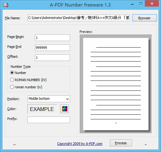 首頁電腦軟體文書編輯 A-PDF Number 替 PDF 加入頁碼 對於所拿到的 PDF 檔案,如果文件內容較長又沒有加入頁碼,要互相討論時,實在很難說明要討論的是哪一頁,再加上若一時讀不完,下次還要翻個老半天,實在很麻煩。想要替沒有原始檔的 PDF 檔案加入頁碼,可以試試 A-PDF Number 這個簡單免費工具,頁碼可加在頁面最下方的左、中、右,簡單好用。 🔔 不錯過任何精彩! 立即訂閱我們的 LINE 官方帳號 每次發佈新文章時,您將會第一時間收到本站文章連結通知,輕鬆掌握最新資訊! 使用 LINE 追蹤文章更新 §相關文章,還可以參閱:PDF Arranger 可調整順序、刪除、旋轉...的多功能 PDF 工具程式Text Replacer 文字替換免費工具如何在 PDF 文件裡添加額外的文字、圖片、圖形或繪圖?Notepad++ 免費多功能記事本軟體doPDF 可在任何程式中藉由[ 列印 ]功能來建立 PDF 檔案 如何使用 A-PDF Number? 完成安裝開啟 A-PDF Number 應用程式後,點擊[ Browser ]來選擇要加入頁碼的 PDF 檔案;選好檔案,在 Number Type 可選數字的格式;Postion 可選頁碼所在位置,右圖則會出現預覽圖,完成設定後,點擊[ Process ]。 A-PDF Number版本:1.3性質:免費適用:Windows官方網站:http://www.a-pdf.com/number/下載:按我下載