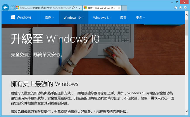 首頁線上工具未分類 立即預約 Windows 10 免費升級 號稱微軟史上最強的作業系統 Windows 10,將於 2015 年 7 月 29 日推出,首波符合資格的 Windows 7 SP1、Windows 8.1 更新版和 Windows Phone 8.1 將免費升級成 Windows 10,現在你就可以透過工作列最右邊處的小型 Windows 圖示,來預約免費升級,讓你在 Windows 10 發行時搶先體驗。 🔔 不錯過任何精彩! 立即訂閱我們的 LINE 官方帳號 每次發佈新文章時,您將會第一時間收到本站文章連結通知,輕鬆掌握最新資訊! 使用 LINE 追蹤文章更新 §相關文章,還可以參閱:Google 親揭爆紅 AI 模型為何叫「Nano Banana」,答案出乎意料「半夜亂取的名字」爆紅全球!Google揭密 Nano Banana 命名背後的意外故事Luckydraw:最佳線上抽獎工具,適合尾牙、婚禮及各項活動抽獎How Old Do I Look:免費線上 AI 年齡分析工具,輕鬆測試你的看起來年齡Google 宣布 goo.gl 縮址服務即將停止 ,但已建立的永久有效 立即預約 Windows 10 免費升級 1.如果你是符合資格的 Windows 7 SP1、Windows 8.1 更新版和 Windows Phone 8.1 的用戶,應該在現行作業系統的工作列最右邊處有一個小型的 Windows 圖示,點擊該圖示,便會出現預約資訊與 Windows 10的功能介紹。 2.想要確認預約結果,可以輸入電子郵件,接下來按[ 傳送確認 ]即可。 3.想要查詢為何沒收到通知或升級的相關資訊可以到 http://www.microsoft.com/zh-tw/windows/windows-10-upgrade 閱讀相關資訊。 4.升級可取得的 Windows 10版本。 Windows 10 資訊網站網址:http://www.microsoft.com/zh-tw/windows/windows-10-upgrade