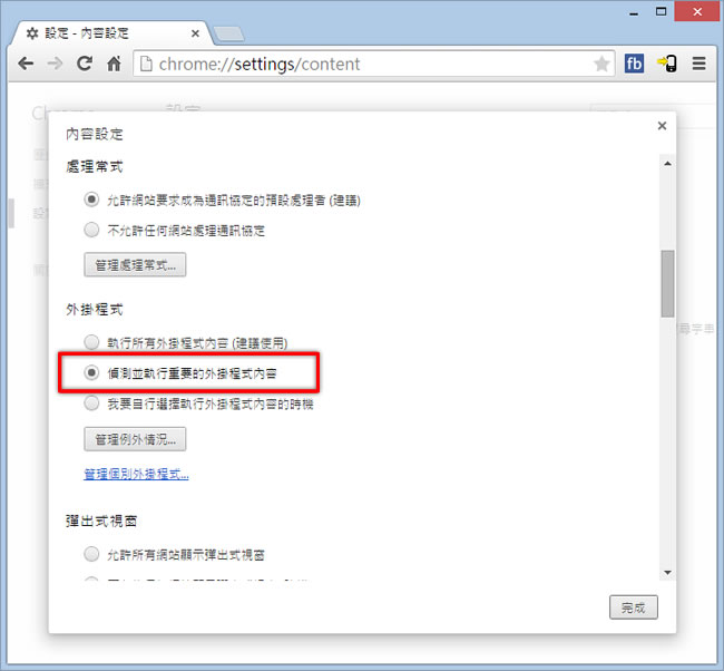 首頁操作技巧瀏覽器 簡單設定就能讓 Google Chrome 瀏覽器更省電 或許你已發覺在筆電上使用 Google Chrome 瀏覽器來作業時,似乎耗電量會比較快,這對僅能使用電池在外工作的筆電實在不利,那麼如何改善呢?在「Google Chrome Blog」中的「Better battery life for your laptop」這篇文章中就有提到,只要手動設定外掛程式的選項,就能有效降低 Chrome 瀏覽器的耗電量,讓你使用筆電上網時能更省電。 🔔 不錯過任何精彩! 立即訂閱我們的 LINE 官方帳號 每次發佈新文章時,您將會第一時間收到本站文章連結通知,輕鬆掌握最新資訊! 使用 LINE 追蹤文章更新 §相關文章,還可以參閱:如何在 Chrome 中顯示 / 隱藏 AI 模式按鈕?flags 設定教學Google AI 模式正式支援繁體中文:一次搞懂功能、應用與影響Edge 不用開側邊欄!網址列直接輸入提示詞就能 AI 生圖與搜圖Edge、Chrome 瀏覽器複製已開分頁到新分頁,這招你一定要學起來Edge Android 版新增底部網址列功能,來看怎麼設定 如何設定 Chrome 瀏覽器外掛程式的選項使其更省電? 1.文章內容。 2.開啟 Chrome 瀏覽器的點擊右上角的設定圖示按鈕後,再點擊[ 設定 ] > [ 顯示進階設定... ]。 3.在隱私權處,點擊[ 內容設定 ]。 4.在外掛程式的選項處改點選[ 偵測並執行重要的外掛程式內容 ]後,再點擊[ 完成 ]即可。