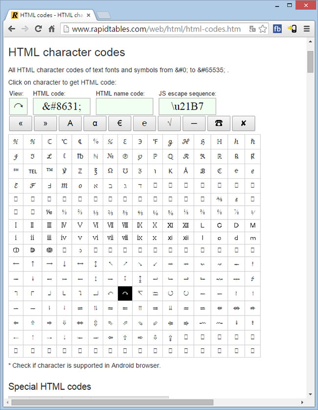 首頁免費素材圖像圖示 HTML character codes 網頁特殊符號應用表 想要在網頁上表現如紙本般的文件內容,通常不難,甚至在排版上都能勝過紙本,但若碰到有特殊符號,例如 5 + 6 ≥ 10 或是 A ∩ B 、∈、∡...等,若是不知道有這些特殊符號可以應用,想要數位化這些紙本內容,也只能做一半,想要應用這些特殊符號,可以來 HTML character codes 這個網頁特殊符號應用表來查詢,每個符號大抵有提供 HTML code、HTML name code、JS escape sequence 這三種編碼方式讓你應用。 🔔 不錯過任何精彩! 立即訂閱我們的 LINE 官方帳號 每次發佈新文章時,您將會第一時間收到本站文章連結通知,輕鬆掌握最新資訊! 使用 LINE 追蹤文章更新 §相關文章,還可以參閱:精心打造的等距美學:Isocons 免費圖示資源庫,CC BY 4.0 授權Map-It:日本地圖素材的免費寶庫,從全國到市町村一網打盡PICaboo! 日系可愛免費向量圖素材庫:設計師必收的創作寶庫GAHAG:日本免費圖庫新選擇,結合アハ體驗互動遊戲的創意素材平台illust STAMPO:日式風格的免費插圖素材網站 如何使用 HTML character codes ? 1.使用瀏覽器進入 HTML character codes 網站後,可以點擊所要的符號。 2.複製該符號編碼後,貼到網頁所要顯示的位置即可。 ↷ HTML character codes網站網址:http://www.rapidtables.com/web/html/html-codes.htm