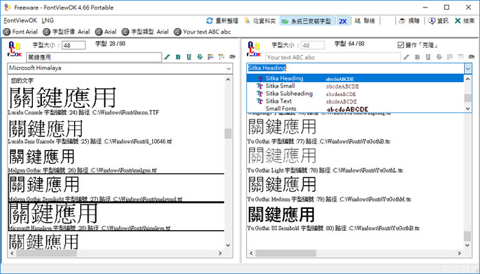 首頁免費字型字型工具 FontViewOK 字型比較免費工具 經常要使用字型的朋友來說,常常為了挑一個字型對該字的適合顯示樣式,就必須要一個個來對字型輸入後看樣式,非常麻煩。FontViewOK 是一套可以輸入一個字或字串,便使用所有存在 Windows 內的字型來呈現對該字或字串,相當好用。如果需要中文的字型,可參考 免費中文字型下載﹝王漢宗教授自由字型﹞,英文字型 FontSpace 免費的英文字型下載 ,若在 Windows 內安裝字型有困難,請參閱 如何在 Windows 安裝新字型。 🔔 不錯過任何精彩! 立即訂閱我們的 LINE 官方帳號 每次發佈新文章時,您將會第一時間收到本站文章連結通知,輕鬆掌握最新資訊! 使用 LINE 追蹤文章更新 §相關文章,還可以參閱:FontShow 本機字型預覽與比較免費工具,線上輕鬆篩選最佳字體Font of Web 輸入網址就幫你找出該網站所使用的字體與下載網址如何建立自己手寫的英文字型?「守寫字」讓手寫字也能變成可用電腦打出的字體Pair & Compare 線上比較 Google Font 字體差異 如何使用 FontViewOK? 1.下載後解壓縮,不需要安裝,執行 [FontViewOK.exe]便可開啟主程式。 2.Lng 功能表,可切換到適合自己的語言介面。 3.可以自行選擇字型與輸入要顯示的文字進行比較。 4.如果需要擷取字型樣式讓別人參考,也可以使用滑鼠右鍵來達成。 FontViewOK版本:8.33語言:英文性質:免費適用:Windows官方網站:https://www.softwareok.com/?seite=Freeware/FontViewOK下載: Windows 32bit 安裝版按我下載 | 免安裝版按我下載 Windows 64bit 安裝版按我下載 | 免安裝版按我下載