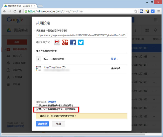 首頁操作技巧Google 如何設定 Google 雲端硬碟檔案分享權限,禁止檢視者下載、列印或複製檔案? 存放在 Google 雲端硬碟內的檔案,除了自己應用外,還可以與朋友共用、分享或讓檢視者進行下載、列印、複製甚至嵌入到網頁內,相當方便,但若有些文件想設定更細部的權限,例如只可開啟閱讀,但不允許檢視者進行下載、列印或複製,現在 Google 已在其雲端硬碟內對檔案增加更細部的功能設定,讓你可以限制檢視者對檔案進行下載、列印或複製等動作,增加文件的控管性。 🔔 不錯過任何精彩! 立即訂閱我們的 LINE 官方帳號 每次發佈新文章時,您將會第一時間收到本站文章連結通知,輕鬆掌握最新資訊! 使用 LINE 追蹤文章更新 §相關文章,還可以參閱:別再只會用兩指縮放 Google 地圖了!這些隱藏手勢讓你效率翻倍照著做就會!Google 官方釋出 NotebookLM 簡報製作的 8 種範例教學機車族專屬!Google Maps 推出 5 款超萌機車圖示 × 8 種顏色,設定步驟看這篇Google Skills:3000+ 門課程助你打造 AI 時代競爭力Google Vids 全解析:一文看懂功能、免費版限制及完整操作步驟 如何設定 Google 雲端硬碟檔案分享權限,禁止檢視者下載、列印或複製檔案? 1.進入 Google 雲端硬碟後,針對想要共用的檔案,使用滑鼠右鍵點擊,並在出現的功能表點擊[ 共用 ]。 2.在出現的頁面,點擊[ 進階 ]。 3.勾選適當的權限即可。