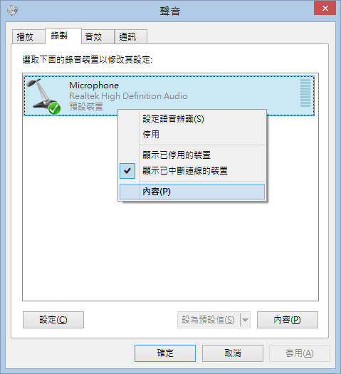首頁操作技巧Windows 如何讓麥克風所輸入的聲音,可以經由喇叭輸出? 在電腦使用麥克風通常都是以遠端通話為主,較少需要由自身的喇叭輸出的需求,但如果唱卡拉 OK 想要混音、教學或是想放大自己的聲音時,該如何設置,才能讓電腦喇叭可以發出克風所輸入的聲音呢?免第三方軟體,透過簡單的設定即可完成。 🔔 不錯過任何精彩! 立即訂閱我們的 LINE 官方帳號 每次發佈新文章時,您將會第一時間收到本站文章連結通知,輕鬆掌握最新資訊! 使用 LINE 追蹤文章更新 §相關文章,還可以參閱:你的 Windows 筆電是真睡還是裝睡?一個設定終結背包發熱耗電學起來!微軟親授 10 個提升 Windows PC 效能的技巧如何升級 Windows 11 25H2?最新版本功能亮點與完整更新步驟Windows 工作列時鐘顯示秒數:真的會影響電池續航力嗎?LTT Labs 完整實測解析Windows 快速取出資料夾檔案名稱清單!內建功能輕鬆搞定,不用額外軟體 如何讓麥克風所輸入的聲音,可以經由喇叭輸出? 1.使用滑鼠右鍵,開啟音量功能表,點擊[ 錄音裝置 ]。 2.在聲音設定視窗中的錄製頁籤中,對 Microphone 使用滑鼠右鍵點擊,再點擊[ 內容 ]。 3.在接聽頁籤中,將[ 聆聽此裝置 ]的選項勾選後,一路按[ 確定 ]關閉所有開啟的設定視窗,即完成設定。