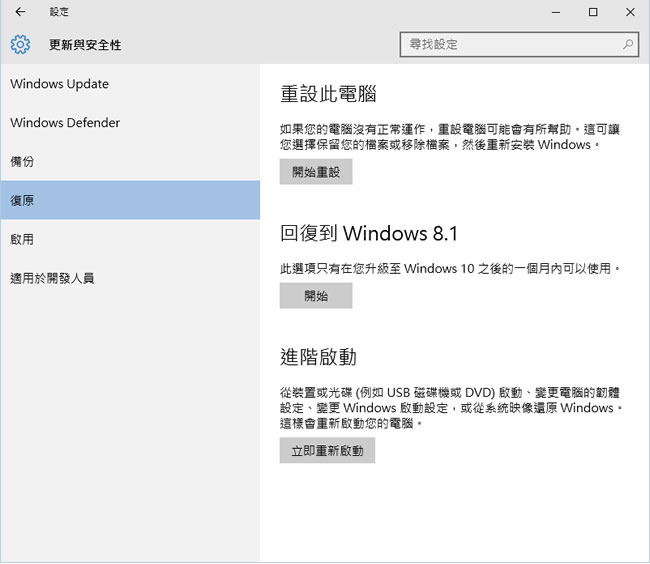 首頁操作技巧Windows Windows 10 如何還原至升級前版本? 不論是先前的預約或是自行透過微軟下載中心下載 Windows 10 來升級,估計想升級的 Windows 用戶大概都已完成,如果還在猶豫或害怕升級後,作業系統不穩定或不習慣,其實大可放心,在完成升級後,如果想要還原成原先的作業系統,只需要簡單的步驟即可完成。 🔔 不錯過任何精彩! 立即訂閱我們的 LINE 官方帳號 每次發佈新文章時,您將會第一時間收到本站文章連結通知,輕鬆掌握最新資訊! 使用 LINE 追蹤文章更新 §相關文章,還可以參閱:你的 Windows 筆電是真睡還是裝睡?一個設定終結背包發熱耗電學起來!微軟親授 10 個提升 Windows PC 效能的技巧如何升級 Windows 11 25H2?最新版本功能亮點與完整更新步驟Windows 工作列時鐘顯示秒數:真的會影響電池續航力嗎?LTT Labs 完整實測解析Windows 快速取出資料夾檔案名稱清單!內建功能輕鬆搞定,不用額外軟體 Windows 10 如何還原至升級前版本? 1.點擊[ 開始 ] > [ 設定 ]來開啟設定視窗。 2.在設定視窗中點擊[ 更新與安全性 ]。 3.切換到[ 復原 ]頁籤,再點擊回復到 Windows 8.1 標籤下的[ 開始 ]按鈕,即可進行回復到原先作業系統版本的程序,不過須注意其回覆說明,此選項只有在升級至 Windows 10 之後的一個月內可以使用。