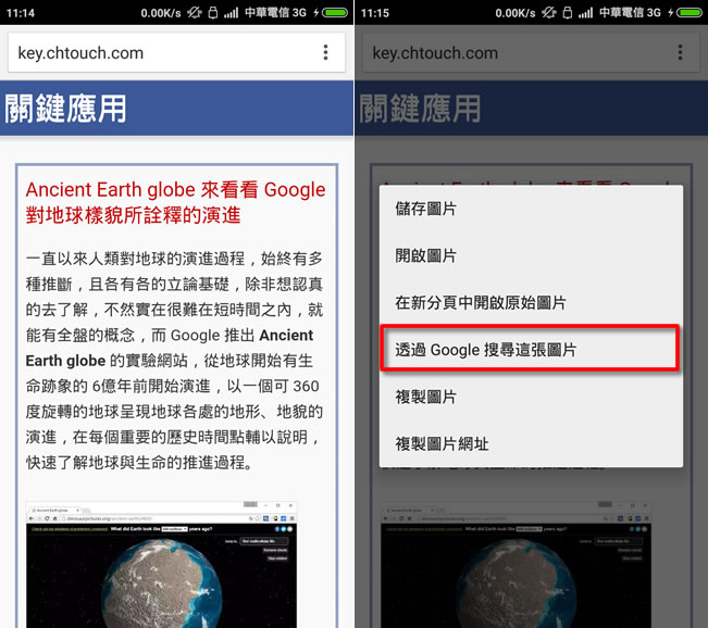 首頁移動設備生產力工具 ﹝Android﹞如何在手機上用瀏覽器進行「以圖搜圖」? 在電腦利用 Chrome 瀏覽器進行「以圖搜圖」只需切換到圖片功能,便可上傳圖片或貼上圖片網址來進行相當簡單,而在 Android 手機或平板等移動設備,也可以很方便的透過 Chrome 瀏覽器進行「以圖搜圖」。 🔔 不錯過任何精彩! 立即訂閱我們的 LINE 官方帳號 每次發佈新文章時,您將會第一時間收到本站文章連結通知,輕鬆掌握最新資訊! 使用 LINE 追蹤文章更新 §相關文章,還可以參閱:Phone On Web 免任何安裝就可以在瀏覽器內使用滑鼠與鍵盤操作手機的各項功能「Edge」如何在手機內捲動瀏覽畫面做長截圖?如何使用 Android 內建鏡頭將文件掃描成 PDF 檔案?1Timer 有語音報時的 App如何在 Android 上使用 Chrome 擷取完整的網頁截圖? 如何在手機上用瀏覽器進行「以圖搜圖」? 1.使用 Chrome 瀏覽器瀏覽網頁時,若碰到有想要搜尋的圖片,可長按該圖片,接下來就會開啟功能表,點擊[ 透過 Google 搜尋這張圖片 ]。 2.結果。
