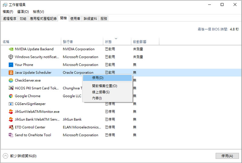 首頁操作技巧Windows [ Windows ]如何關閉隨作業系統開機而自動啟動的程式? 有些應用程式會隨著 Windows 作業系統開機後而自動在背景執行,這對有些使用者可能很方便,但對有些使用者會覺得要使用時再開啟即可,不需要去占用作業系統的資源,且也可以增加開機的速度。有別於 Windows 7 之前的作業系統,在 Windows 10 我們可以透過「工作管理員」的功能來查看或開啟 / 關閉隨作業系統開機而啟動的程式,以求得較好的開機速度及作業系統效能。 🔔 不錯過任何精彩! 立即訂閱我們的 LINE 官方帳號 每次發佈新文章時,您將會第一時間收到本站文章連結通知,輕鬆掌握最新資訊! 使用 LINE 追蹤文章更新 §相關文章,還可以參閱:學起來!微軟親授 10 個提升 Windows PC 效能的技巧如何升級 Windows 11 25H2?最新版本功能亮點與完整更新步驟Windows 工作列時鐘顯示秒數:真的會影響電池續航力嗎?LTT Labs 完整實測解析Windows 快速取出資料夾檔案名稱清單!內建功能輕鬆搞定,不用額外軟體Windows 11 如何縮小工作列圖示按鈕,打造更精簡桌面視覺 如何關閉隨作業系統開機而自動啟動的程式? 1.要查看或操作隨作業系統開機而自動啟動的程式,我們必須使用「工作管理員」,而要開啟「工作管理員」可以開啟命令提示字元後,輸入以下指令。 msconfig.exe 2.另外一種方式,也可以工作列上使用滑鼠右健點擊後,在再點擊[ 工作管理員 ];或使用[ ctrl +alt +delete ]鍵盤快速鍵來開啟。 3.開啟工作管理員後,其所列出的項目上,可以使用滑鼠右鍵來點擊切換其開啟或關閉狀態。