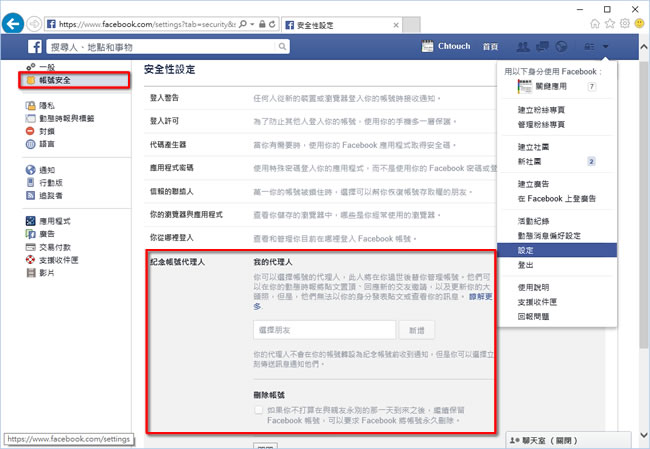 首頁線上工具社群與通訊 Facebook 紀念帳號代理人功能上線 繼 Google 推出「閒置帳戶管理員」的功能讓帳號閒置超過多少時間後,Google 就會使用簡訊或郵件來通知當初所指定的管理員接管該帳號;而 Facebook 也推出「紀念帳號代理人」的功能,當帳號被 Facebook 轉設為紀念帳號時,則由代理人接管自己帳號,兩者最大不同點,則是在時間點的認定上,Google 的「閒置帳戶管理員」其閒置時間,可自行設定,而 Facebook 的「紀念帳號代理人」功能,則是由親友主動回報 Facebook 並將帳號轉設為紀念帳號。 🔔 不錯過任何精彩! 立即訂閱我們的 LINE 官方帳號 每次發佈新文章時,您將會第一時間收到本站文章連結通知,輕鬆掌握最新資訊! 使用 LINE 追蹤文章更新 §相關文章,還可以參閱:Meta AI 讓 Facebook 大頭貼會動了!還有動態背景、照片風格轉換新玩法馬上爆富超好用!LINE Bank × 胸毛公寓招財貼圖,農曆新年免費領取馬年行大運!精選8款新春招財LINE免費貼圖,OPEN將、罐頭豬陪你過好年「LINE 社群」也能開店!打通聊天到下單的最後一哩路存發票也能玩遊戲!LINE 發票管家改版重點一次看 如何設定 Facebook 紀念帳號代理人? 1.使用瀏覽器或手機進入 Facebook 帳號設定,在 2.設定前,建議你看懂代理人功能說明,明瞭代理人的權限,什麼可以做,什麼不可以做,當然你也可以選擇植間關閉該帳號。 Facebook網站網址:https://www.facebook.com/