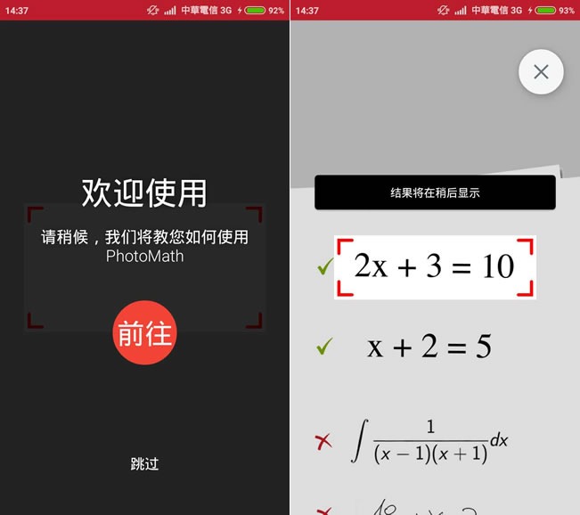 首頁移動設備學習資源 PhotoMath 透過照相機輸入數學算式,並列出解題步驟 許多較複雜的數學算式,若是要自己手動來輸入,實在困難,若是使用 PhotoMath 這個應用程式,只要開啟照相機的功能,對準數學算式,就能自動輸入,並列出計算步驟,讓學數學也能變得很簡單,且 iOS、Android 都支援。 🔔 不錯過任何精彩! 立即訂閱我們的 LINE 官方帳號 每次發佈新文章時,您將會第一時間收到本站文章連結通知,輕鬆掌握最新資訊! 使用 LINE 追蹤文章更新 §相關文章,還可以參閱:「國中英語補救教學」國中七、八、九年級課文語音+字詞、句型與聽力練習+1200 單字[ Android ]聽憲法、行政 - 讓你用聽的就能背法條﹝Android﹞MyScript Calculator 可用手寫算式的計算機iStair+ 訓練大腦與手指反應力的遊戲(全力階段+)注音查詢 - 查詢字的注音符號與漢語拼音 如何在移動設備內使用 PhotoMath? 1.完成安裝,開啟 PhotoMath 後,便會有動畫教學。 2.實際應用時,只需將鏡頭對準數學算式,便會自動解析。 3.點擊進入答案項,便會列出計算步驟。 PhotoMathAPP性質:免費安裝網址: Android 按我前往 iOS 按我前往