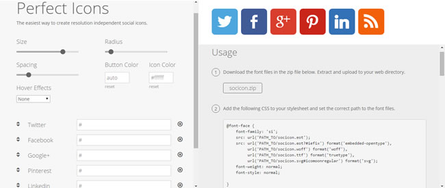 1.使用瀏覽器進入 Perfect Icons 網站,預設就會出現 Twitter、Facebook、Google+、Pinterest、Linkedin、RSS等地連結按鈕與語法,可以透過左側欄的調整工具進行按鈕順序、大小、圓角、距離、顏色與自己網站鏈結網址的調整,每次的調整都會即時反映在按鈕圖示上,。