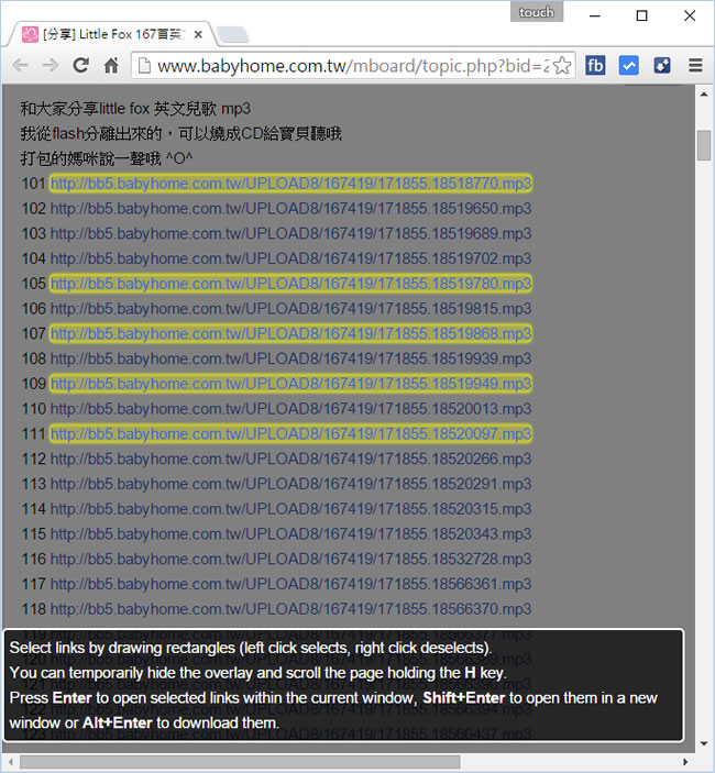 首頁瀏覽器擴充功能上傳下載 uSelect iDownload 批次下載網頁中的檔案連結 - Chrome 瀏覽器擴充功能 每當在網頁看到有想要下載的圖片、MP3 或連結的檔案,很多人的做法都是使用滑鼠右鍵一個個點擊來下載,這實在很累人,如果你是使用 Google 的 Chrome 瀏覽器,可以來安裝 uSelect iDownload 這個擴充功能,下次碰到有網頁要下載的檔案連結,變可輕鬆的批次下載。 🔔 不錯過任何精彩! 立即訂閱我們的 LINE 官方帳號 每次發佈新文章時,您將會第一時間收到本站文章連結通知,輕鬆掌握最新資訊! 使用 LINE 追蹤文章更新 §相關文章,還可以參閱:RedNote Video Downloader:小紅書影片下載器,免費瀏覽器擴充功能DownThemAll 讓你輕鬆下載網頁內所有檔案(瀏覽器擴充功能)「貓抓」可解析串流影片 m3u8 檔案並下載成 MP4 的瀏覽器擴充功能Apple Design Resources - Apple 官方提供的各種裝置外框、圖示、字體...等設計資源免費下載使用Mobile TikTok & Downloader 抖音影片下載瀏覽器擴充功能 如何安裝及使用 uSelect iDownload ? 1.使用 Chrome 瀏覽器到達 uSelect iDownload 安裝網址後,按下[+ 加到CHROME ]便會開 始下載及安裝。 2.安裝完成後,會出現提示。 3.針對有要下載圖片或檔案的網頁,按剛剛所安裝的圖示按鈕,該網頁便會呈現灰色透明,使用滑鼠左鍵點擊所要下載的連結,該連結會以黃色框線標示;使用滑鼠右鍵點擊便可取消標示。 3.接下來,按 Alt + Enter 快速鍵,便可批次下載回來。 uSelect iDownload性質:免費官方網站:https://chrome.google.com/webstore/detail/uselect-idownload/ileabdhfjmgaognikmjgmhhkjffggejc?hl=zh-TW