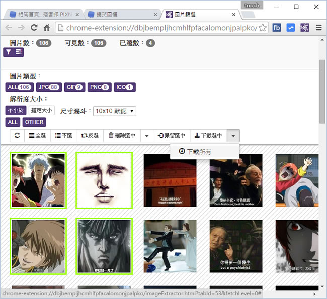 首頁瀏覽器擴充功能上傳下載 「圖片助手」一次下載網頁所有圖片 - Chrome 瀏覽器擴充功能 網路資源豐富,尤其是影音與圖片更是大家想收藏的標的物,針對圖片,如果還在一張張的使用滑鼠右鍵來下載,建議你可以試試「圖片助手」(ImageAssistant)這個 Chrome 瀏覽器的擴充功能,可針對圖片的檔案類型、解析度進行圖片篩選,也可以方便的使用反選、刪除選中或下載所有的功能選項,快速選出要下載的圖片,非常方便。 🔔 不錯過任何精彩! 立即訂閱我們的 LINE 官方帳號 每次發佈新文章時,您將會第一時間收到本站文章連結通知,輕鬆掌握最新資訊! 使用 LINE 追蹤文章更新 §相關文章,還可以參閱:RedNote Video Downloader:小紅書影片下載器,免費瀏覽器擴充功能DownThemAll 讓你輕鬆下載網頁內所有檔案(瀏覽器擴充功能)「貓抓」可解析串流影片 m3u8 檔案並下載成 MP4 的瀏覽器擴充功能Apple Design Resources - Apple 官方提供的各種裝置外框、圖示、字體...等設計資源免費下載使用Mobile TikTok & Downloader 抖音影片下載瀏覽器擴充功能 如何安裝及使用「圖片助手」(ImageAssistant)來下載網頁內的圖片? 1.使用 Chrome 瀏覽器到達 「圖片助手」(ImageAssistant)安裝網址後,按下[ 加到 CHROME ]便會開始下載及安裝。 2.安裝完成後,會出現提示。 3.接下來,當碰到有想要下載圖片的網頁時,就可以按下剛剛所安裝的擴展按鈕 > [ 提取本頁圖片 ]。 4.可透過圖片上方的篩選功能來篩選要下載的圖片或是使用滑鼠來圈選所要下載的圖片,不想選擇也可以選擇下載所有。 圖片助手(ImageAssistant)性質:免費官方網站:https://chrome.google.com/webstore/detail/imageassistant-batch-imag/dbjbempljhcmhlfpfacalomonjpalpko