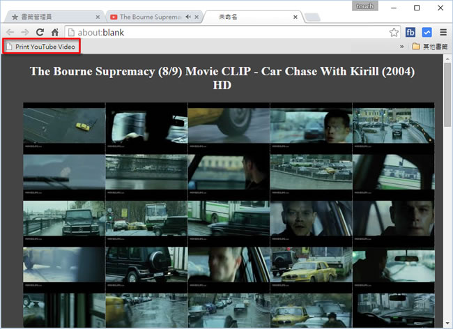 首頁線上工具影像繪圖 Print YouTube Video 線上快速將 YouTube 影片內容擷取成圖片 YouTube 有豐富的影音資源,且後續所支援的應用也越來越多,不但可以進行影片下載,還可以將聲音單獨擷取出成 MP3...而這些都是非常受到大眾歡迎的應用。如果想將影片內容擷取成影片呢?其實不需要去將影片下載後,再利用相關程式來擷取,只需在瀏覽器上安裝 Print YouTube Video 插件,任何正在播出的 YouTube 影片,都可以相當快速的製作出影片全片相關的 PNG 圖片。 🔔 不錯過任何精彩! 立即訂閱我們的 LINE 官方帳號 每次發佈新文章時,您將會第一時間收到本站文章連結通知,輕鬆掌握最新資訊! 使用 LINE 追蹤文章更新 §相關文章,還可以參閱:跟著做就會!教你用 ChatGPT 製作具職業形象的漫畫風頭像Put!所見即所得的 AI 提示詞圖庫:讓你看著範例圖,複製就能做出同級作品Google 親自示範:Nano Banana AI 圖像編輯工具的 13 個熱門玩法照片角度不滿意?AI 幫你調整!3D Camera Control 讓舊照片任意變換視角Meta AI 免費帳戶也能用 Midjourney!無限生成 AI 圖片,台灣可用 如何安裝與使用 Print YouTube Video 插件? 1.使用瀏覽器進入 Print YouTube Video 插件網站,找到 Print YouTube Video 按鈕,使用滑鼠點擊後不放,並拖拉到瀏覽器上方的書籤列內後放開,在書籤列便會有 Print YouTube Video 插件。 2.針對正在播放的 YouTube 影片,按下該按鈕,便會產生新分頁來呈現影片內容所結取出的 PNG 圖片。 Print YouTube Video網站網址:http://www.labnol.org/internet/print-youtube-video/28217/