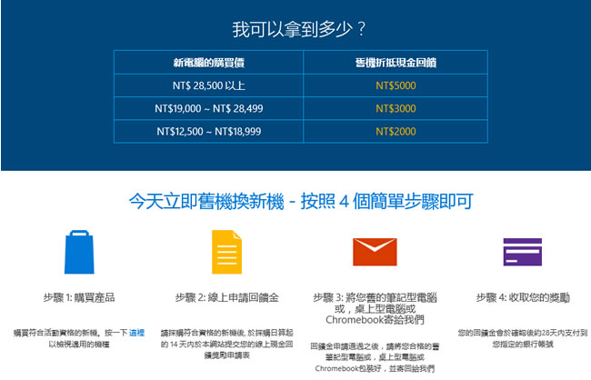 首頁線上工具未分類 買電腦嗎?利用舊機換新機,微軟就幫你出 2000 ~ 5000 的現金補助款 現在很流行以舊換新就可以由「新」的來發回饋金,汽車如此,現在電腦也可以ㄟ,104-10-27 日前,只要購買預裝 Windows 8.1 或 Windows 10 作業系統的筆記型、二合一型或桌上型電腦而產生出的舊機又能符合微軟的規範,微軟就會幫你出 2000 ~ 5000 的現金補助款,而且是直接匯到你所指定的銀行帳號。 🔔 不錯過任何精彩! 立即訂閱我們的 LINE 官方帳號 每次發佈新文章時,您將會第一時間收到本站文章連結通知,輕鬆掌握最新資訊! 使用 LINE 追蹤文章更新 §相關文章,還可以參閱:Google 親揭爆紅 AI 模型為何叫「Nano Banana」,答案出乎意料「半夜亂取的名字」爆紅全球!Google揭密 Nano Banana 命名背後的意外故事Luckydraw:最佳線上抽獎工具,適合尾牙、婚禮及各項活動抽獎How Old Do I Look:免費線上 AI 年齡分析工具,輕鬆測試你的看起來年齡Google 宣布 goo.gl 縮址服務即將停止 ,但已建立的永久有效 微軟舊電腦換新電腦回饋現金活動介紹 1.進入活動網址後,可以看到活動的辦法與申請回饋金的步驟。 2.所購買的新機必須符合微軟的規範。 3.舊機須符合的規範。 4.建議你看清楚活動每個細節,詳細閱讀條款與條件,像是符合資格的新機種還是有例外,還有常見問題的回答說明。 微軟舊機換新機回饋金活動網站網址:https://easytradeup.com/tw/zh/pages/tradeup/home