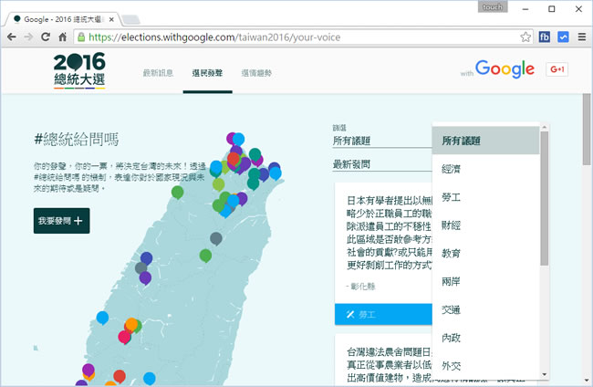 首頁線上工具生活資訊 Google - 2016 總統大選網站 每四年一次的總統大選,總是牽動人心,如果關心這次 2016 總統大選的選情,又不想讓色彩濃厚的電視台、報紙、民調或是永遠都是那些人在發言的網站或政論節目而左右,其實可以來看看 Google 所製作的 2016 總統大選網站,除了有用候選人 Google 指數所做出的選情趨勢分析外,另外就是可讓選民針對經濟、勞工、財經、教育...等等議題進行提問,雖不知是否有人會回答,但可以從中看出該議題大家所關心的一些方向與期望,也能提供候選人在政見上更能貼近民意。 🔔 不錯過任何精彩! 立即訂閱我們的 LINE 官方帳號 每次發佈新文章時,您將會第一時間收到本站文章連結通知,輕鬆掌握最新資訊! 使用 LINE 追蹤文章更新 §相關文章,還可以參閱:Apple Music 台灣新用戶優惠:6個月免費暢聽,領取方式與限制一次看!2026春節追劇清單!Netflix 2月必看攻略:燒腦推理、火爆動作片,陪你從初一爽追到開工!459 萬人搶 60 萬份!運動幣中獎號碼公布,快查你的身分證尾數都馬一起GO!LINE GO新年優惠最高拿$800優惠券,還有一個月乘車金等你抽過年搭高鐵自由座要排多久?看LINE就知道 台灣高鐵×LINE TODAY推出春節限定燈號預估服務 Google - 2016 總統大選網站介紹 1.使用瀏覽器進入 Google - 2016 總統大選網站,有選情趨勢、選民發聲、最新訊息 可供點擊。 2.選情趨勢。 3.選民發聲。 Google-2016 總統大選網站網址:https://elections.withgoogle.com/taiwan2016