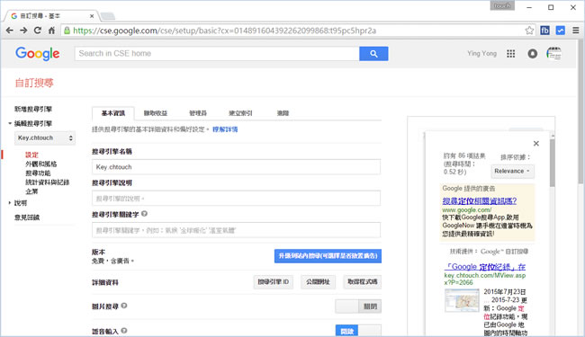 首頁操作技巧Google 如何在網站加入 Google 自訂搜尋引擎,搜尋網站內的相關文章? 有在經營網站的朋友,通常都會在網頁內建立一個搜尋引擎,讓用戶可以輸入關鍵字就能快速找到站內相關文章,想要建立這個搜尋引擎,功力好的當然可以自己撰寫出來,若是不想這麼麻煩,建議你可以使用 Google 的自訂搜尋引擎,只要填入相關要求的資訊,就能輕易建立出搜尋自己網站內關鍵字的搜尋引擎,還能免去後續要自己維護的麻煩。 🔔 不錯過任何精彩! 立即訂閱我們的 LINE 官方帳號 每次發佈新文章時,您將會第一時間收到本站文章連結通知,輕鬆掌握最新資訊! 使用 LINE 追蹤文章更新 §相關文章,還可以參閱:別再只會用兩指縮放 Google 地圖了!這些隱藏手勢讓你效率翻倍照著做就會!Google 官方釋出 NotebookLM 簡報製作的 8 種範例教學機車族專屬!Google Maps 推出 5 款超萌機車圖示 × 8 種顏色,設定步驟看這篇Google Skills:3000+ 門課程助你打造 AI 時代競爭力Google Vids 全解析:一文看懂功能、免費版限制及完整操作步驟 如何在網站加入 Google 自訂搜尋引擎,搜尋網站內的相關文章? 1.使用瀏覽器進入 https://cse.google.com/cse/sitesearch/create 網站,接下來,輸入網站名稱,選擇語言後按[ 建立 ](網站名稱的輸入方式可參考下圖紅色框圈出的說明)。 2.接下來,設定相關的參數資訊,也可以都用預設即可,右側方會出現搜尋框的及時預覽,可以實際輸入關鍵字進行測試。 3.點擊[ 取得程式碼 ]便可複製給出的程式碼,貼到網頁要呈現的位置。