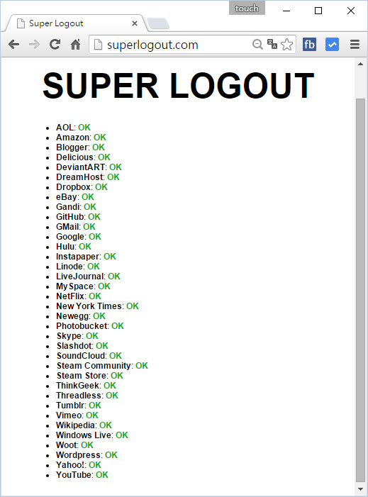 首頁線上工具資訊安全 SUPER LOGOUT 一次幫你登出含 Dropbox、Yahoo、Skype 在內的近 40個網站帳號 現在的網站大部分都有記憶登入帳號、密碼的功能,除了方便使用者免去一再輸入的麻煩,也增加用戶使用意願,不過對用戶來說,很難能記得自己登入過哪些網站又有哪些網站會有記住帳號、密碼的功能,如果,想要一次性的登出這些網站,可以來試試 SUPER LOGOUT 這個網站,只要進入該網站就會自動幫你將 AOL、Amazon、Blogger、Delicious、DeviantART、DreamHost、Dropbox、eBay、Gandi、GitHub、GMail、Google、Hulu、Instapaper、Linode、LiveJournal、MySpace、NetFlix、New York Times、Newegg、Photobucket、Skype ......等近 40個網站進行登出的動作。 🔔 不錯過任何精彩! 立即訂閱我們的 LINE 官方帳號 每次發佈新文章時,您將會第一時間收到本站文章連結通知,輕鬆掌握最新資訊! 使用 LINE 追蹤文章更新 §相關文章,還可以參閱:注意!Let's Encrypt 憑證期限從 90 天減半至 45 天,因應方法看這裡朱雀大模型檢測:騰訊推出的 AI 內容鑑別工具,精準識別 AI 生成文章與圖片如何透過「Google One」檢查 Gmail 是否因資料侵害事件外洩到暗網上?Batch PDF Encryptor 替 PDF 檔案加入擁有者與開啟密碼保全措施 免費可批量如何將 LINE 帳號與 Google 帳號同步? 如何使用 SUPER LOGOUT? 使用瀏覽器進入 SUPER LOGOUT 便會進行登出的動作(所以,如果你只是想看看,沒有要登出,建議不要進入該網站)。 SUPER LOGOUT網站網址:http://superlogout.com/
