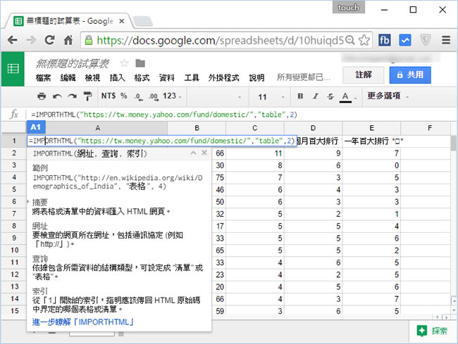 1.開啟「Google 試算表」滑鼠左鍵雙擊要插入的儲存格後輸入,例如 =IMPORTHTML("https://tw.money.yahoo.com/fund/domestic/","table",2),離開該儲存格後,便會將數據導入。