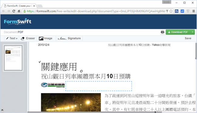 首頁線上工具生產力工具 FormSwift Free PDF Editor 線上輕鬆編輯 PDF 檔,可抹除文字、加入圖片、文字、符號或簽名檔 對現有的 PDF 檔案,若無編輯工具,可以來試試 FormSwift 網站所提供的 Free PDF Editor 功能,只要上傳 PDF 檔案,就可對該檔案進行抹除文字、加入圖片、文字、符號或簽名檔等動作,對中文也沒有任何問題,完成編輯便可下載,相當簡便。 🔔 不錯過任何精彩! 立即訂閱我們的 LINE 官方帳號 每次發佈新文章時,您將會第一時間收到本站文章連結通知,輕鬆掌握最新資訊! 使用 LINE 追蹤文章更新 §相關文章,還可以參閱:ChatGPT 語氣微調功能上線!教你調整暖度、熱情度與表情符號ChatGPT 變身超級 App!OpenAI 推出應用程式目錄,免費版同樣可用ChatGPT 圖像功能大升級!GPT Image 1.5 五大實戰技巧一次公開免費版也能用!ChatGPT + Adobe Acrobat,對話轉 PDF 超簡單Gemini vs ChatGPT 訂閱方案完整比較:哪個更值得你的投入? 1.使用瀏覽器進入 FormSwift Free PDF Editor ,將 PDF 檔案使用滑鼠拖拉到 Drag and drop your PDF here 該位置上或點擊[ Select a PDF to Upload ]來上傳要編輯的 PDF 檔案。 2.完成上傳,左上角便會出現功能表,可抹除文字、加入圖片、文字、符號或簽名檔。 3.點擊右上角的[ Download PDF ]便可將編輯好的 PDF 文件下載回自己的電腦。 FormSwift Free PDF Editor網站網址:https://formswift.com/edit-pdf