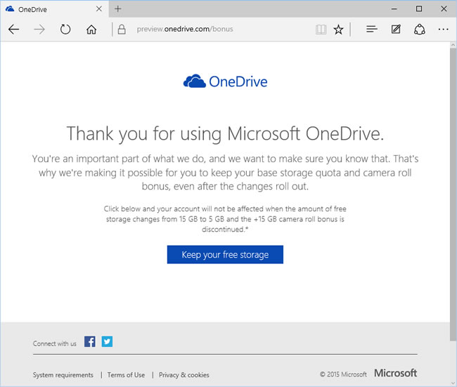 首頁線上工具雲端儲存 如何保留微軟 OneDrive 15 GB 雲端硬碟空間? 重要檔案要做好異地備份,避免因為整顆硬碟故障,造成資料無法救回,因此很多人會將重要的檔案,放在雲端硬碟內。若你是使用微軟的 OneDrive 免費的硬碟空間,那麼你需要注意微軟將要縮減 OneDrive 免費硬碟空間從 15GB 變 5GB,同時原本開啟相簿同步所獲贈的 15GB 也會一併取消的消息。如果你是 OneDrive 的愛用戶,想保留這 15GB + 15GB雲端硬碟空間,現在可利用微軟所提供的頁面來進行保留。 🔔 不錯過任何精彩! 立即訂閱我們的 LINE 官方帳號 每次發佈新文章時,您將會第一時間收到本站文章連結通知,輕鬆掌握最新資訊! 使用 LINE 追蹤文章更新 §相關文章,還可以參閱:「免費圖片空間」Freeimage.host 讓您輕鬆上傳圖片並獲得分享連結LinkPicture 免費圖床上傳產生 URL 外連網址 圖片可直接檢視或內嵌到網頁imghut 免費圖片分享空間 可直接嵌入網頁使用Archive Forever 輸入網址就可以將網頁或網頁截圖永久儲存在區塊鏈上ZoomHub 線上免費圖片分享空間 可內嵌到其它網頁 如何保留微軟 OneDrive 15 GB 雲端硬碟空間? 1.使用瀏覽器進入 https://preview.onedrive.com/bonus 網頁,便可看到說明,直接按[ Keep your free storage ]即可。 2.接下來會確定使用權限,按[ 是 ]後,便會確認成功。 微軟保留雲端空間網站網址:https://preview.onedrive.com/bonus
