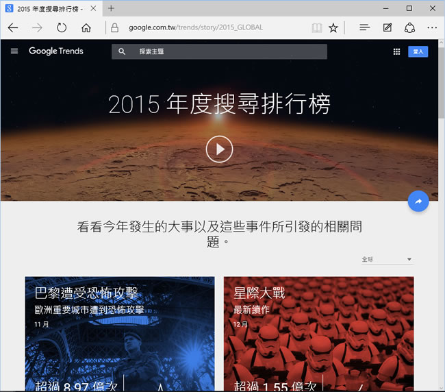 首頁線上工具益智遊戲 Google 公布 2015年年度台灣各類關鍵字搜尋排行 Google 公布其 2015年年度搜尋排行榜,包含台灣在內與其他國家的熱搜關鍵字,可以參考 Google 官網的統計數據。 🔔 不錯過任何精彩! 立即訂閱我們的 LINE 官方帳號 每次發佈新文章時,您將會第一時間收到本站文章連結通知,輕鬆掌握最新資訊! 使用 LINE 追蹤文章更新 §相關文章,還可以參閱:Google Doodle 萬聖節遊戲登場!小精靈 45 週年特別版完整介紹毫秒級反應力大挑戰!用 Reaxon 訓練大腦、眼睛與手的協調反應2048 Cupcakes 經典單人 2048 滑塊線上遊戲,AI 輔助輕鬆挑戰高分免費線上拼圖遊戲平台:iLoveJigsaw 可自行上傳圖片製作拼圖Songlio:線上聽音樂猜歌曲名稱遊戲,可自訂歌曲題庫並與多人一起挑戰 台灣: 「快速竄升關鍵字」- 颱風 「快速竄升政治人物」- 洪秀柱 「快速竄升政治與社會議題」- 八仙塵爆 「快速竄升電影」- 我的少女時代 「快速竄升電視劇」- 武媚娘傳奇 「熱門搜尋關鍵字」- Facebook 「熱門政治人物」- 柯文哲 「熱門政治與社會議題」- 時價登錄 「熱門電影」- 我的少女時代 「熱門電視劇」- 武媚娘傳奇 如何操作: 1.使用瀏覽器進入 Google 2015年年度搜尋排行榜 網站,便可見各類的關鍵字熱搜排行,上方的台灣與2015分別可看以往的各地的統計數據。 2.也可進入全球探索,了解世界各國的發生過哪些事。 Google Trends網站網址:https://www.google.com.tw/trends/topcharts#vm=cat&geo=TW&date=2015&cid