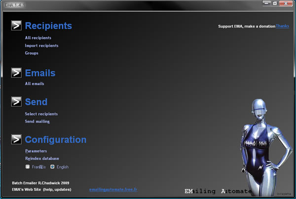 EMA﹝EMailing Automate﹞是一套完全免費的電子郵件批次﹝群發﹞發送程式,支援從 Excel、文字檔或CSV導入聯絡人及EMail Address列表,導入後可利用EMA內建的資料庫重新整理郵件地址或建立新的群組關係,支援HTML格式郵件內容且內建簡單的 RTF 編輯器,EMA 沒有發送郵件數量及使用時間上的限制,也沒有廣告,完全免費。