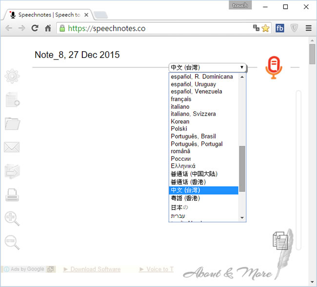 首頁線上工具翻譯辨識 Speechnotes 免費的語音轉文字網頁服務 每當開會做紀錄,總是需要聽得進且手要動得快,不然就需要重新播放檔案,重新記錄,相當麻煩,不過現在你可以透過 Speechnotes 這個免費的語音轉文字網頁服務,其支援英文、中文、日語、韓文......,可及時幫你將發言者所說的語音直接轉成文字,如果速度夠快,還能直接標註逗號、句號、分號...等標點符號,完成編輯後,可直接轉 Word 或 文字檔,也可以直接轉存到 Google Drive、直接使用電子郵件寄出或直接列印出來,相當方便。 🔔 不錯過任何精彩! 立即訂閱我們的 LINE 官方帳號 每次發佈新文章時,您將會第一時間收到本站文章連結通知,輕鬆掌握最新資訊! 使用 LINE 追蹤文章更新 §相關文章,還可以參閱:AI 翻譯新選擇:ChatGPT 翻譯功能全方位介紹與 Google 翻譯對比ScanQR 免費線上二維碼辨識工具,輕鬆解讀 QR Code 內容TTSMaker 線上文字轉語音免費工具,中文也沒問題Whisper JAX 免費語音轉文字工具,適用 Microphone、Audio File 及 YouTube 影片OLOCR 識別圖片或 PDF 內容文字,支援多國語言 1.使用瀏覽器進入 Speechnotes ,先選擇所要使用的語言。 2.接下來,使用滑鼠按麥克風圖示,開始接收語音,右側會出現可加註的標點符號;左邊欄功能,可在完成編輯後,讓你進行後續的應用。 Speechnotes網站網址:https://speechnotes.co/