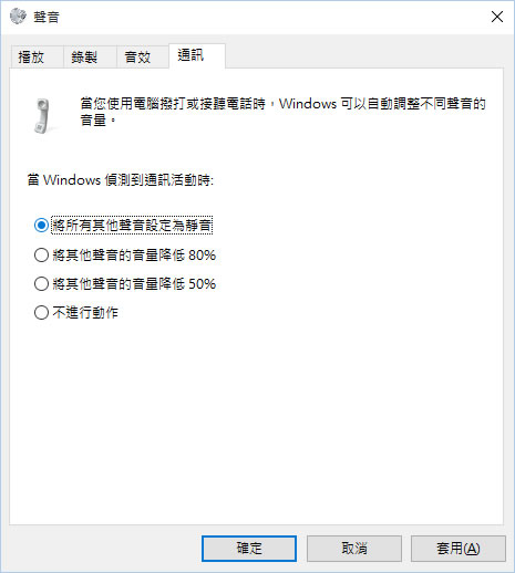 首頁操作技巧Windows [ Windows 10 ]如何在撥打網路電話時,讓其他聲音自動靜音? Skype 是很多人撥打網路電話的首選,無論是 PC to PC、PC to Phone 甚至是由 PC 轉撥其聲音品質都相當好,但如果每次撥打或接聽電話都要先將其他聲音一一關閉,會有點麻煩,如何在撥打網路電話時,讓其他聲音自動靜音或降低音量?其實只要簡單的設定,且無須安裝第三方軟體,便能達成。 🔔 不錯過任何精彩! 立即訂閱我們的 LINE 官方帳號 每次發佈新文章時,您將會第一時間收到本站文章連結通知,輕鬆掌握最新資訊! 使用 LINE 追蹤文章更新 §相關文章,還可以參閱:你的 Windows 筆電是真睡還是裝睡?一個設定終結背包發熱耗電學起來!微軟親授 10 個提升 Windows PC 效能的技巧如何升級 Windows 11 25H2?最新版本功能亮點與完整更新步驟Windows 工作列時鐘顯示秒數:真的會影響電池續航力嗎?LTT Labs 完整實測解析Windows 快速取出資料夾檔案名稱清單!內建功能輕鬆搞定,不用額外軟體 [ Windows 10 ]如何在撥打網路電話時,讓其他聲音自動靜音? 1.開啟[ 控制台 ] > [ 聲音 ]。 2.在聲音設定視窗中,切換到通訊頁籤,便可根據自身需要來勾選。