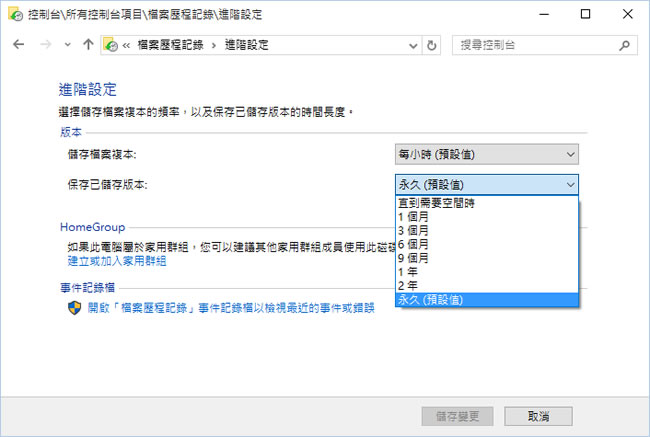 5.備份的時間點與版本儲存的時間,可以在[ 進階設定 ]中來操作,基本上只要儲存媒體空間夠大,是可以永久保存。