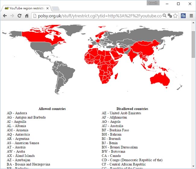 首頁線上工具影音視聽 YouTube region restriction checker 線上檢查 YouTube 影片被允許與禁止播放的地區 常在 YouTube 觀看影片時,若遇到"上傳者並未允許這部影片在您的國家/地區播放" 也許會有點無奈,真想要看,也要知道影片允許被播放的區域,才能透過 VPN 或 Proxy 來解決,YouTube region restriction checker 這個網站提供輸入影片便能查詢影片被允許與禁止播放的地區,簡單實用。 🔔 不錯過任何精彩! 立即訂閱我們的 LINE 官方帳號 每次發佈新文章時,您將會第一時間收到本站文章連結通知,輕鬆掌握最新資訊! 使用 LINE 追蹤文章更新 §相關文章,還可以參閱:sound&go 耳機測試工具:免安裝測左右聲道、頻率響應Veo 3.1「材料轉影片」功能升級:支援直式影片與 4K 畫質來了!OpenAI Sora Android 版上線 Google Play,台灣用戶同步開放Google 親授 Veo 3.1 用電影語言與音效設計打造完美 AI 影片Sora Watermarker:一鍵為影片加上 OpenAI Sora 浮水印 如何利用 YouTube region restriction checker 檢查 YouTube 影片被允許與禁止播放的地區? 1.碰到有限制影片播放區域時,會收到如下的訊息。 2.使用瀏覽器進入 YouTube region restriction checker 網站後,貼上要檢查的YouTube 影片網址。 3.按[ 提交 ]後,便會顯示被允許與被限制的區域。 YouTube region restriction checker網站網址:http://polsy.org.uk/stuff/ytrestrict.cgi