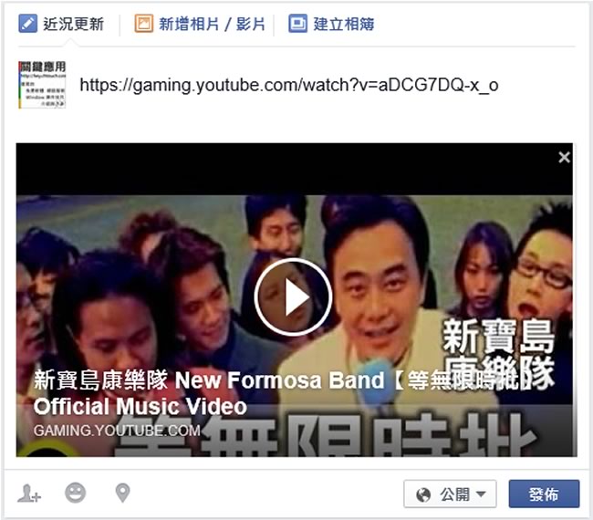 首頁線上工具網頁瀏覽 如何讓 YouTube 影片分享連結可以在 FaceBook 上顯示滿版的預覽圖? 如果有要轉貼 YouTube 影片網址分享到 FaceBook 上的需求,常會發現轉貼後,都是在格內呈現一半不到的影片預覽圖,而另一半則是影片的標題與說明,想要改變這樣的情況其實很簡單,只需要稍微更改 YouTube 影片分享連結網址,便可讓影片的標題放到影片的下方,讓影片預覽圖在格內呈現滿版。 🔔 不錯過任何精彩! 立即訂閱我們的 LINE 官方帳號 每次發佈新文章時,您將會第一時間收到本站文章連結通知,輕鬆掌握最新資訊! 使用 LINE 追蹤文章更新 §相關文章,還可以參閱:Google 2025 台灣年度搜尋榜:地震、普發現金、Gemini,我們都在找什麼?ChatGPT Atlas 瀏覽器問世:三大 AI 功能顛覆你的上網方式Microsoft Rewards 點數全自動狂賺法,一鍵設定、天天進帳!如何將 DeepSeek 安裝成應用程式?DrawLink:免費將網址轉換為吸睛視覺卡片,多樣卡片樣式可選 如何讓 YouTube 影片分享連結可以在 FaceBook 上顯示滿版的預覽圖? 1.如果在 FaceBook 上直接貼上 YouTube 網址,只會在格內呈現不到一半的預覽圖。 2.想要呈現滿版預覽圖,可以將 YouTube 前方的 www 改成 gaming 後,再貼一次。