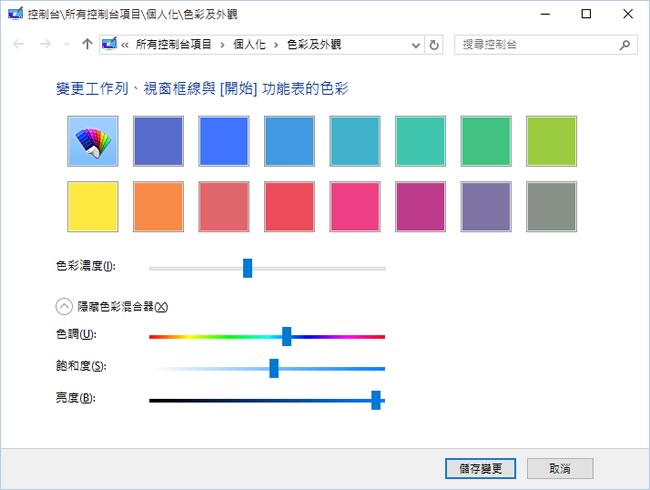 首頁操作技巧Windows [ Windows ]如何變更工作列、視窗框線與[開始]功能表的色彩? Windows 10 作業系統用久後,如果想要變更 工作列、視窗框線與[開始]功能表的顏色,該如何做呢?其實很簡單,不需要靠第三方的應用軟體,Windows 作業系統本身就具有該功能,可讓你個人化喜愛的色彩。 🔔 不錯過任何精彩! 立即訂閱我們的 LINE 官方帳號 每次發佈新文章時,您將會第一時間收到本站文章連結通知,輕鬆掌握最新資訊! 使用 LINE 追蹤文章更新 §相關文章,還可以參閱:你的 Windows 筆電是真睡還是裝睡?一個設定終結背包發熱耗電學起來!微軟親授 10 個提升 Windows PC 效能的技巧如何升級 Windows 11 25H2?最新版本功能亮點與完整更新步驟Windows 工作列時鐘顯示秒數:真的會影響電池續航力嗎?LTT Labs 完整實測解析Windows 快速取出資料夾檔案名稱清單!內建功能輕鬆搞定,不用額外軟體 如何變更工作列、視窗框線與[開始]功能表的色彩? 1.預設的視窗框線顏色。 2.按鍵盤 Win + R 來打開[ 執行 ]視窗,並輸入 control desk.cpl,Advanced,@Advanced 後,按[ Enter ]鍵。 3.接下來便會看到個人化視窗,可自行選定色彩後,按[ 儲存變更 ]即可。 4.變更後。 ※想要回預設的色彩,只要選色卡上的第一個即可回系統預設顏色