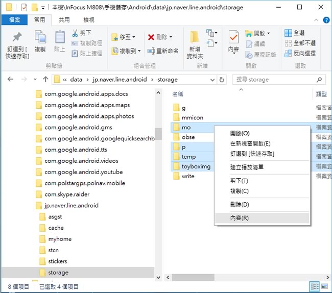 首頁線上工具社群與通訊 [ LINE ]如何清理暫存檔案,騰出儲存空間? line App 的用戶很多,加上媒體的宣傳報導與地方政府不顧資安的選定使用,幾乎已成為手機的必裝軟體,很多人 line 用久之後,可能都會發現明明還有儲存空間但卻無法安裝新的 App,究其原因,則在有些 App 所使用的暫存資料夾,以 line 為例,開啟手機的檔案管理員,可見的資料夾就是 Pictures > line 與 line_movie 這兩個資料夾,裡面存放著所下載的影片與圖檔,這是可見亦可輕易就刪除,但 line 的暫存檔不僅僅只有這兩個,將手機使用 USB 接到電腦,透過搜尋,將可發現更多的暫存資料夾。 🔔 不錯過任何精彩! 立即訂閱我們的 LINE 官方帳號 每次發佈新文章時,您將會第一時間收到本站文章連結通知,輕鬆掌握最新資訊! 使用 LINE 追蹤文章更新 §相關文章,還可以參閱:存發票也能玩遊戲!LINE 發票管家改版重點一次看LINE 教你玩轉 2025聖誕節!召喚熊大特效、秒送禮物、搶免費貼圖全攻略LINE「偵測可疑網站」功能設定教學:3步驟啟用,有效防範詐騙連結小紅書被封怎麼辦?免 VPN!5 分鐘教你用 DNS 快速解決LINE 官方親授換機教學,帳號轉移、備份、登入完整換機流程指南 如何清理 line 的暫存檔案,騰出儲存空間? 1.手機使用 USB 連接到電腦後,開啟檔案總管,並搜尋 jp.naver.line.android 關鍵字。 2.開啟所搜尋到的資料夾,並將 p、mo、temp、toyboximg 選取後,使用滑鼠右鍵點擊>[ 內容 ],看看所占用的空間。 ※若占用儲存空間太大,則可將這四個資料夾通通刪除。