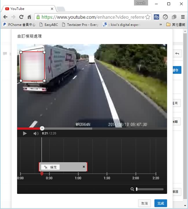 首頁操作技巧Google 如何透過 YouTube 將影片中的人臉、車牌或指定區域模糊化? 要遮蔽影片中不想要出現的部分,YouTube 繼人臉模糊功能後,再度加入指定區域模糊化功能,意思是說,你可以指定影片中某一想要加入馬賽克的物件,例如移動中的車牌、廣告等,YouTube 會在影片全程中自動幫你進行追蹤鎖定該物件,免去需要手動的麻煩。 🔔 不錯過任何精彩! 立即訂閱我們的 LINE 官方帳號 每次發佈新文章時,您將會第一時間收到本站文章連結通知,輕鬆掌握最新資訊! 使用 LINE 追蹤文章更新 §相關文章,還可以參閱:別再只會用兩指縮放 Google 地圖了!這些隱藏手勢讓你效率翻倍照著做就會!Google 官方釋出 NotebookLM 簡報製作的 8 種範例教學機車族專屬!Google Maps 推出 5 款超萌機車圖示 × 8 種顏色,設定步驟看這篇Google Skills:3000+ 門課程助你打造 AI 時代競爭力Google Vids 全解析:一文看懂功能、免費版限制及完整操作步驟 如何透過 YouTube 將影片中的人臉、車牌或指定區域模糊化? 1.將影片上傳到 YouTube 之後,開啟影片頁面,點擊影片下方[ 強化 ]按鈕。 2.接下來,切換到模糊效果頁籤並點擊自訂模糊處理[ 編輯 ]。 3.使用滑鼠圈選要模糊化的範圍,圈選後,會進行鎖定已進行追蹤,可鎖定多個物件,確定後,按[ 完成 ]。 4.回到影片播放來檢視。
