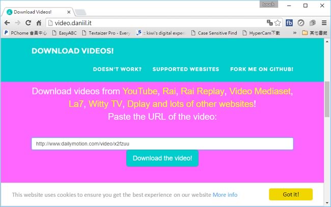 首頁線上工具上傳下載 利用 Download videos 網站,免費下載 Facebook、YouTube、dailymotion...等影片 提供影音免費分享服務的網站有很多,像是大家熟悉的 Facebook、YouTube、dailymotion 等,想要下載收藏這些影音網站的影片,有很多都是針對單一網站進行設計,因此有 Facebook 專用的下載器,也有 dailymotion 的,當然有更多是屬於 YouTube 的專用下載器,相當麻煩,不過這些全部被 Download videos 這個網站所整合了,除了上述的這三個網站,另外還支援很多...很多...很多,有下載影片需求的朋友,可以多加利用。 🔔 不錯過任何精彩! 立即訂閱我們的 LINE 官方帳號 每次發佈新文章時,您將會第一時間收到本站文章連結通知,輕鬆掌握最新資訊! 使用 LINE 追蹤文章更新 §相關文章,還可以參閱:M3U8 Player:本地瀏覽器處理,播放、下載、轉 MP4 一站免費完成getM3U8 免費線上工具:輕鬆下載 M3U8 串流影片並轉檔 MP4SnapWC 免費影片下載器:一鍵搞定 YT、IG、FB、抖音等 10,000+ 平台影片、音訊、圖片需要分享圖片連結?試試 PiXhost 免費圖床服務P2PFileShare 線上 P2P 傳檔免費工具,免安裝無檔案大小限制直接瀏覽器傳輸 如何利用 Download videos 來下載網路影片? 1.使用瀏覽器進入 Download videos 網站後,先點擊右上方的 Supported websites 按鈕,來看看所支援下載的網站。 2.我們以 dailymotion 為例,將複製好的 dailymotion 影片網址,貼到 Paste the URL of the video: 輸入欄內,再按[ Download the Video ]按鈕。 3.接下來就會列出可下載不同解析度的影片,點擊就可下載。 ※其他網站的下載方式都一樣。 Download videos網站網址:http://video.daniil.it/