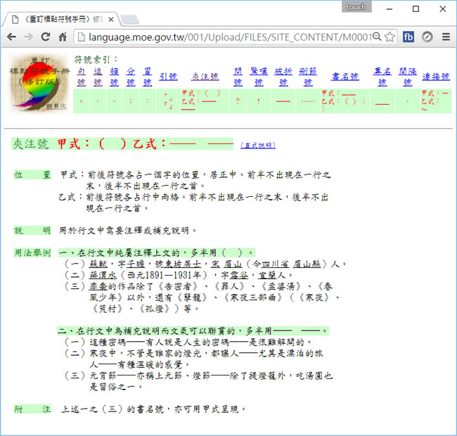 首頁教育學習國語文 如何正確使用「標點符號」? 學生時期應該都學過標點符號的使用方法,常用的例如句號用於一個語義完整的句末,不會用於疑問句、感嘆句;而逗號則是用於隔開複句內各分句,或標示句子內語氣的停頓。但不常用的像是頓號、分號、冒號、引號、夾注號、問號、驚嘆號、破折號、刪節號、書名號、專名號、間隔號、連接號等,又該如何正確地使用,建議你可以到教育部《重訂標點符號手冊》修訂版來溫故知新。 🔔 不錯過任何精彩! 立即訂閱我們的 LINE 官方帳號 每次發佈新文章時,您將會第一時間收到本站文章連結通知,輕鬆掌握最新資訊! 使用 LINE 追蹤文章更新 §相關文章,還可以參閱:AI太炎:免費古漢語大語言模型,支援釋義、翻譯、標點與識典功能「新式九宮格作業簿」可線上自編國字練習的格子簿產生器「花蓮縣字音字形學習網」一個陪伴孩子成長、學習的最佳網站教育部線上「生字練習簿」系統,自己就可建立生字練習題,還可以加入注音空格國民中小學學生簿本(國語作業簿及作文簿)免費下載 如何正確使用標點符號? 1.使用瀏覽器進入 《重訂標點符號手冊》修訂版 ,下方有每個標點符號的符號圖示。 2.點擊進入標點符號使用說明。 《重訂標點符號手冊》修訂版網站網址:https://language.moe.gov.tw/001/Upload/FILES/SITE_CONTENT/M0001/HAU/F2.HTML