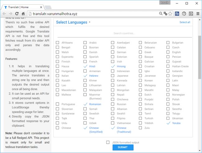 首頁線上工具翻譯辨識 透過 Translatr 網站,一次就能將原文翻譯成多國語言 不論是常用的「Google 翻譯」或是「Microsoft 翻譯」一次都只能翻譯成一個想要的語言,例如英文翻譯成中文或是中文翻譯成日文,這對需要多國語言翻譯,相當不方便,這時候,我們可以透過 Translatr 這個網站,將要翻譯的語言輸入後,便可勾選要翻譯的語言,一次便能搞定,免去分批取得翻譯結果。 🔔 不錯過任何精彩! 立即訂閱我們的 LINE 官方帳號 每次發佈新文章時,您將會第一時間收到本站文章連結通知,輕鬆掌握最新資訊! 使用 LINE 追蹤文章更新 §相關文章,還可以參閱:AI 翻譯新選擇:ChatGPT 翻譯功能全方位介紹與 Google 翻譯對比ScanQR 免費線上二維碼辨識工具,輕鬆解讀 QR Code 內容TTSMaker 線上文字轉語音免費工具,中文也沒問題Whisper JAX 免費語音轉文字工具,適用 Microphone、Audio File 及 YouTube 影片OLOCR 識別圖片或 PDF 內容文字,支援多國語言 如何利用 Translatr 網站,一次就能將原文翻譯成多國語言? 1.使用瀏覽器進入 Translatr 將原文輸入。 2.接下來勾選原文下方,所要翻譯的語言,可多選,完成後,按[ SUBMIT ]。 3.在結果處,便能檢視所勾選要翻譯的語言。 Translatr網站網址:http://translatr.varunmalhotra.xyz/