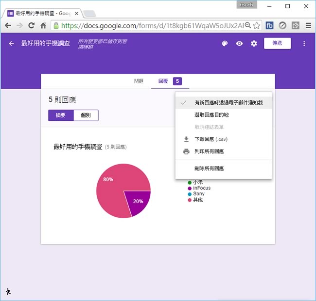 首頁線上工具生產力工具 如何建立 Google 表單,並在有回應時,立即以電子郵件通知? Google 雲端硬碟內除了有免費的硬碟儲存與檔案分享空間外,更提供了類似微軟 Office 的文件、試算表與簡報等功能,其中「Google 表單」也是深受大家歡迎的功能,不但可以自訂建立收集資料的表單格式,也非常容易就能建立問卷調查表格,且提供以電子郵件、網路連結或是嵌入到 HTML 內,讓自訂蒐集資料的動作,不必再為技術、展示與維護而傷腦筋。 🔔 不錯過任何精彩! 立即訂閱我們的 LINE 官方帳號 每次發佈新文章時,您將會第一時間收到本站文章連結通知,輕鬆掌握最新資訊! 使用 LINE 追蹤文章更新 §相關文章,還可以參閱:OpenAI 在 ChatGPT 中測試廣告|哪些帳戶受影響、廣告運作原則一次看在蝦皮當賣家,商品如何定價?手續費、免運、稅金怎麼算?蝦皮手續費計算機幫你全搞定!Google AI Plus 降到 260 元對決 ChatGPT Go!誰的功能更值得訂閱?ChatGPT Go 月付 290 元值得嗎?免費版、Plus 完整比較用 AI 做出的電影,YouTube 就看得到!一起來欣賞這部贏得百萬美元的突尼西亞短片《Lily》 如何建立 Google 表單,並在有回應時,立即以電子郵件通知? 1.使用瀏覽器登入 Google 雲端硬碟,並建立 Google 表單。 2.建立表單,可透過表單右方的浮動工具列加入多媒體與增加區段。 4.切換到回覆頁籤,可設定有回覆時要進行的動作與回覆資料的統計下載。 5.透過右上方的[ 傳送 ],可將建立好的表單,以電子郵件進行傳送、連結或嵌入到其他網頁內。 Google 雲端硬碟網站網址:https://www.google.com/intl/zh-TW/drive/