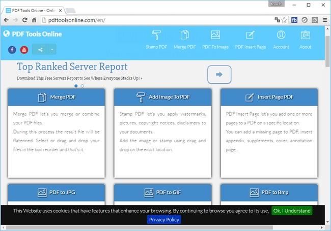 首頁線上工具檔案管理 PDF Tools Online - PDF 合併、轉圖檔、插入頁面、加入圖片免費線上工具 PDF 類型文件越來越受歡迎,不但 Google 與 Microsoft 等大廠的文書編輯軟體都支援 PDF 文件的轉出,其他網站的相關應用也不斷地陸續推出,PDF Tools Online 提供 PDF 文件合併,在原有的 PDF 上插入新頁面,轉出 JPG、PNG、GIF、BMP 等圖檔的免費線上服務,讓取得的 PDF 文件也能有後續的應用。 🔔 不錯過任何精彩! 立即訂閱我們的 LINE 官方帳號 每次發佈新文章時,您將會第一時間收到本站文章連結通知,輕鬆掌握最新資訊! 使用 LINE 追蹤文章更新 §相關文章,還可以參閱:VERT:開源本地端檔案格式轉換器,隱私優先的免費瀏覽器轉檔工具PageSplitty 線上 PDF 分割轉 JPG、PNG、WebP 圖工具,支援 5GB 大小的大檔案PixDuplicate:免上傳快速找出並刪除重複照片的免費線上工具Adapter:全方位影片、音檔及圖片格式轉換免費軟體,支援影片轉音檔與圖片,音檔及圖片格式互轉TextCompare 線上比較 Excel、PDF 及圖片,快速找出檔案不同之處 如何使用 PDF Tools Online 對 PDF 檔案做後續的應用? 1.使用瀏覽器進入 PDF Tools Online 網站,便可看到所有提供的功能。 2.以 PDF to GIF 的功能為例,點擊[ Upload PDF here ]來選擇 PDF 檔案,上傳完成後,點擊[ Let's Go ]。 3.在預覽的頁面中,可選擇要轉換圖檔的頁面,或是轉全部頁面,最後點擊[ Convert to Image ],處裡完成後,便會自動下載。 PDF Tools Online網站網址:http://pdftoolsonline.com/en/